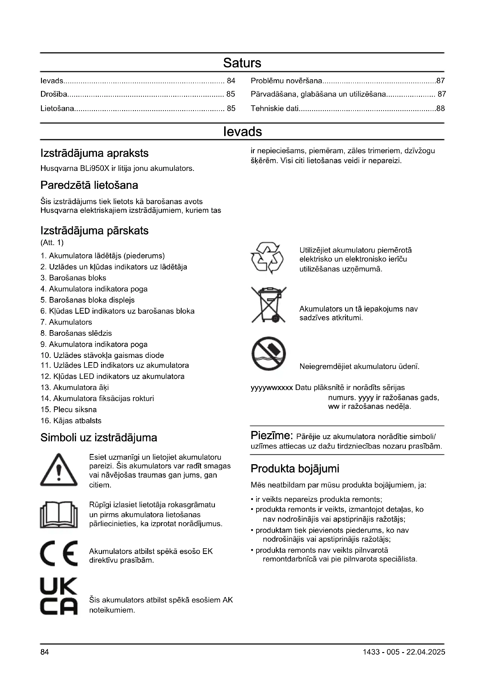 Simboli uz izstrādājuma Esiet uzmanīgi un lietojiet akumulatoru pareizi. Šis akumulators var radīt smagas vai nāvējošas traumas gan jums, gan citiem. Rūpīgi izlasiet lietotāja rokasgrāmatu un pirms akumulatora lietošanas pārliecinieties, ka izprotat norādījumus. Akumulators atbilst spēkā esošo EK direktīvu prasībām. Šis akumulators atbilst spēkā esošiem AK noteikumiem. Utilizējiet akumulatoru piemērotā elektrisko un elektronisko ierīču utilizēšanas uzņēmumā. Akumulators un tā iepakojums nav sadzīves atkritumi. Neiegremdējiet akumulatoru ūdenī. yyyywwxxxx Datu plāksnītē ir norādīts sērijas numurs. yyyy ir ražošanas gads, ww ir ražošanas nedēļa. Piezīme: Pārējie uz akumulatora norādītie simboli/ uzlīmes attiecas uz dažu tirdzniecības nozaru prasībām. Produkta bojājumi Mēs neatbildam par mūsu produkta bojājumiem, ja: