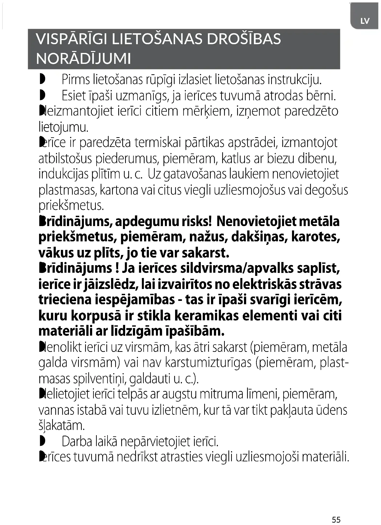 Brīdinājums ! Ja ierīces sildvirsma/apvalks saplīst, ierīce ir jāizslēdz, lai izvairītos no elektriskās strāvas trieciena iespējamības - tas ir īpaši svarīgi ierīcēm, kuru korpusā ir stikla keramikas elementi vai citi materiāli ar līdzīgām īpašībām.