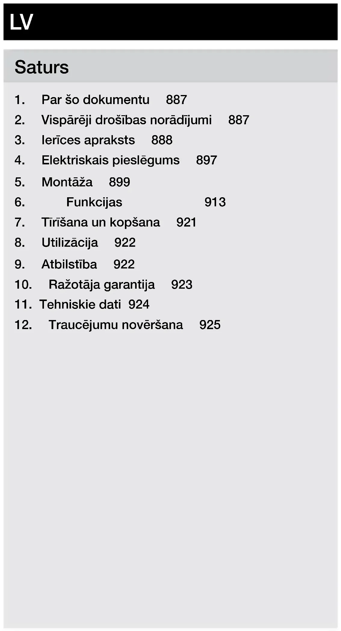 - Uzglabājiet pieejamā vietā. – Darbošanās ar elektrisko strāvu var izraisīt bīstamas situācijas. Pieskaršanās strāvu vadošām daļām var izraisīt šoku, apdegumus vai nāvi. – Darbu ar elektrotīkla spriegumu jāveic profesionāli kvalicētam personālam. – Jāievēro vietējo instalēšanas un pieslēgšanas tehnisko priekšrakstu prasības (piem., D: VDE 0100, A: ÖVE- ÖNORM E8001-1, CH: SEV 1000). – Izmantojiet tikai oriģinālās detaļas. – Remontu drīkst veikt tikai specializētas darbnīcas.– 888 – Saturs