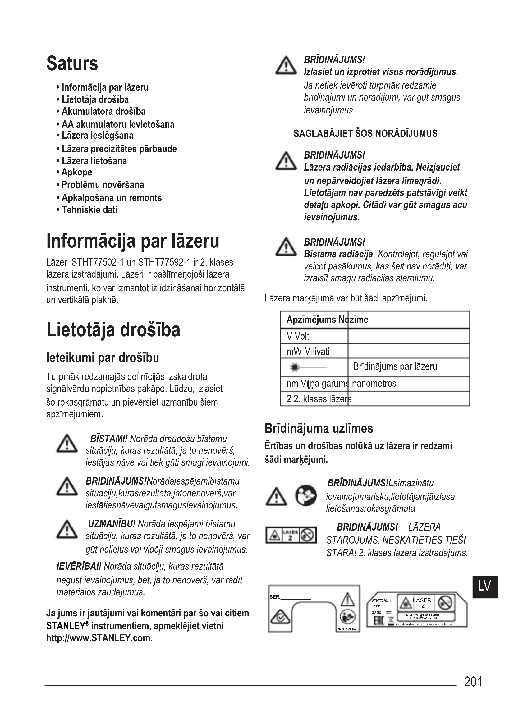 - Tehniskie dati Informācija par lāzeru Lāzeri STHT77502-1 un STHT77592-1 ir 2. klases lāzera izstrādājumi. Lāzeri ir pašlīmeņojoši lāzera instrumenti, ko var izmantot izlīdzināšanai horizontālā un vertikālā plaknē. Lietotāja drošība Ieteikumi par drošību Turpmāk redzamajās denīcijās izskaidrota signālvārdu nopietnības pakāpe. Lūdzu, izlasiet šo rokasgrāmatu un pievērsiet uzmanību šiem apzīmējumiem. BĪSTAMI! Norāda draudošu bīstamu situāciju, kuras rezultātā, ja to nenovērš, iestājas nāve vai tiek gūti smagi ievainojumi. BRĪDINĀJUMS! Norāda iespējami bīstamu situāciju, kuras rezultātā, ja to nenovērš, var iestāties nāve vai gūt smagus ievainojumus. UZMANĪBU! Norāda iespējami bīstamu situāciju, kuras rezultātā, ja to nenovērš, var gūt nelielus vai vidēji smagus ievainojumus. IEVĒRĪBAI! Norāda situāciju, kuras rezultātā negūst ievainojumus, bet, ja to nenovērš, var radīt materiālos zaudējumus. Ja jums ir jautājumi vai komentāri par šo vai citiem STANLEY