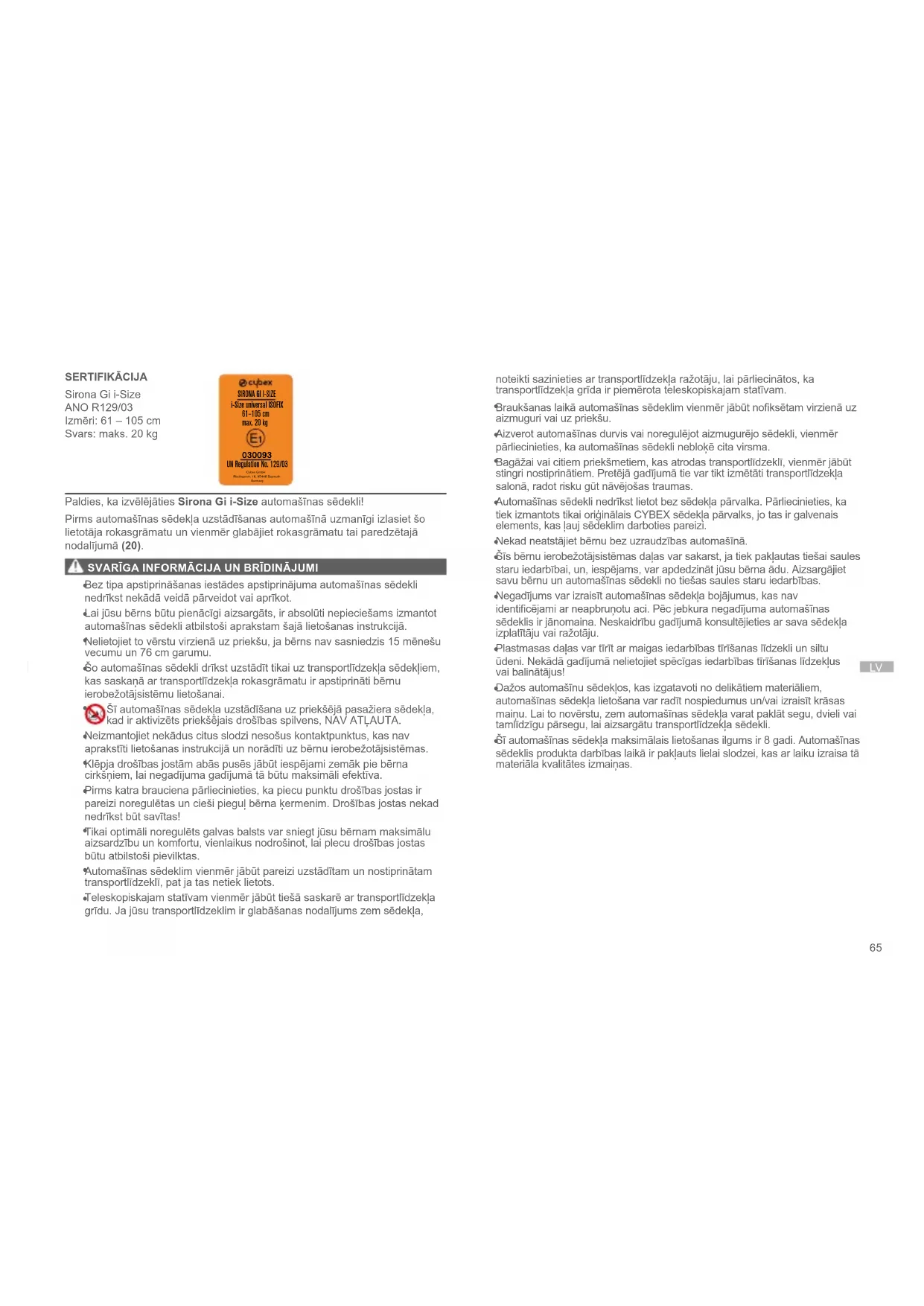 Šī ir uzlabota i-Size bērnu ierobežotājsistēma. Tā ir apstiprināta saskaņā ar ANO noteikumiem Nr. R129/03 izmantošanai i-Size saderīgās transportlīdzekļu sēdekļu pozīcijās atbilstoši tam, kā to transportlīdzekļa ražotājs norādījis transportlīdzekļa lietotāja rokasgrāmatā. Ja jūsu transportlīdzeklim nav i-Size sēdekļu pozīcijas, lūdzu, skatiet pievienoto transportlīdzekļu tipu sarakstu. Jaunāko tipu saraksta versiju skatiet vietnē www.cybex-online.com.