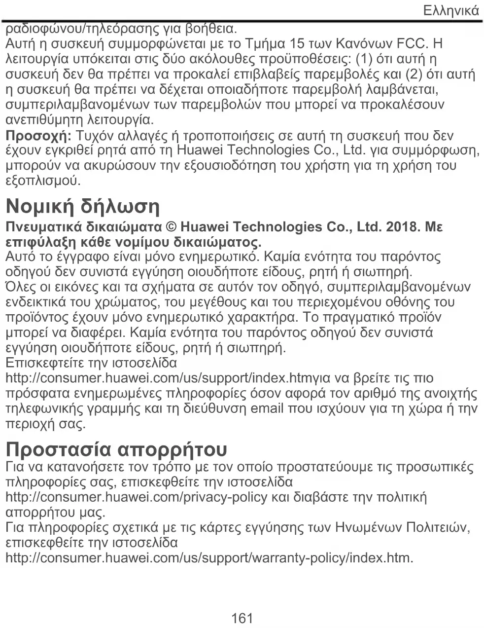 Juridiskais paziņojums Autortiesības © Huawei Technologies Co., Ltd. 2018. Visas tiesības aizsargātas. Šis dokuments ir paredzēts tikai informācijai. Neviena šīs pamācības daļa nav uzskatāma ne par kāda veida garantiju: ne tiešu, ne izrietošu. Visi šajā pamācībā ietvertie attēli, tostarp, bet ne tikai attēli, kuros redzama produkta krāsa, izmēri un displeja saturs, ir paredzēti tikai jūsu uzziņai. Faktiskais produkts var atšķirties. Neviena šīs pamācības daļa nav uzskatāma ne par kāda veida garantiju: ne tiešu, ne izrietošu. Lai uzzinātu jaunāko palīdzības tālruņa līnijas numuru un e-pasta adresi savā valstī vai reģionā, apmeklējiet vietni http://consumer.huawei.com/us/support/index.htm. Konfidencialitātes aizsardzība Lai uzzinātu vairāk par to, kā mēs izmantojam un aizsargājam jūsu personas informāciju, apmeklējiet tīmekļa vietni http://consumer.huawei.com/privacy-policy, lai skatītu mūsu konfidencialitātes politiku. Informāciju par garantijas karti Savienotajās Valstīs skatiet vietnē http://consumer.huawei.com/us/support/warranty-policy/index.htm.Lietuvių