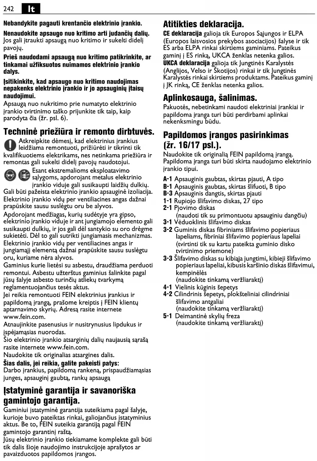 Izmantojiet tikai tādus kritienu novēršanai paredzētus aizsarglīdzekļus, kas atbilst tālāk norādītajām prasībām. Pretējā gadījumā pastāv risks gūt nopietnas vai pat nāvējošas traumas. – Izmantojiet tikai tādus kritienu novēršanai paredzētus aizsarglīdzekļus, kas atbilst jaunākajām prasībām saskaņā ar ANSI/ISEA 121 un kuru siksnu garums nostieptā stāvoklī nepārsniedz 1,2 m. – Raugieties, lai elektroinstrumenta svars kopā ar piederumiem nepārsniegtu kritiena novēršanai paredzētajam aizsarglīdzeklim pieļaujamo maksimālo slodzi. Ievērojiet droš ības norādījumus un instrukcijas, kas ir pievienotas aizsargietaisei pret nokrišanu. Pirms katras lietošanas pārbaudiet, vai kritiena novēršanai paredzētais aizsarglīdzeklis nav bojāts piemēram, tajā nav iegriezumu, ieplīsumu vai iziruša auduma vai bojātu šuvju. Bojātus kritienu novēršanai paredzētus aizsarglīdzekļus nedrīkst izmantot, un tie nekavējoties ir jānomaina. Pirms katras lietošanas pārbaudiet stiprinājuma vietu pie elektroinstrumenta, vai tā ir stabili nostiprināta un tajā nav bojājumu, piemēram, plīsumu vai asu malu. Vaļīgas vai bojātas stiprinājuma vietas nedrīkst izmantot kritienu novēršanai paredzēto aizsarglīdzekļu piestiprināšanai. Neizmantojiet kritiena novēršanai paredzēto aizsarglīdzekli personīgās droš ības nodrošināšanai un nepiestipriniet to pie sevis. Nemēģiniet satvert krītošu elektroinstrumentu. Neizmantojiet kritiena novēršanai paredzēto aizsarglīdzekli kustīgu daļu tuvumā. Kritiena novēršanai paredzētais aizsarglīdzeklis var ieķerties tajās un radīt lielas briesmas. Pirms kritiena novēršanai paredzētā aizsarglīdzekļa izmantošanas pārbaudiet, vai elektroinstrumenta atvienojamās daļas ir stabili nostiprinātas. Pārliecinieties, ka kritiena novēršanai paredzētais aizsarglīdzeklis netraucē elektroinstrumenta un tā aizsargierīču lietošanai. Pievienojiet aizsargietaisi pret nokrišanu šim mērķim paredzētajā stiprinājuma vietā elektroinstrumentā tikai tādā veidā, kā dā tas ir parādīts šajā instrukcijā (skatīt lappusi 6). Uzturēšana darba kārtībā un klientu apkalpošanas dienests. Ņemiet vērā, ka elektriskos darbarīkus drīkst remontēt, apkopt un pārbaudīt tikai kvalificēti elektriķi, jo nepareiza remonta veikšana var radīt būtisku risku lietotājam. Ārkārtas darbības apstākļos, apstrādājot metālus, elektriskā darbarīka iekšpusē var uzkrāties vadītspējīgi putekļi. Var tikt bojāta elektriskā darbarīka aizsargizolācija. Regulāri izpūtiet elektriskā darbarīka iekšpusi ar sausu, saspiestu gaisu baz eļļas, izmantojot ventilēšanas spraugas. Apstrādājot ģipsi saturošus materiālus, šo materiālu putekļi var nosē sties elektroinstrumenta korpusā un uz slēdža elementa un mitruma iespaidā sacietēt. Tas var nelabvēlīgi ietekmēt slēdža mehānisma darbību. Caur ventilācijas atvērumiem izpūtiet elektroinstrumenta korpusa iekšpusi un slēdža elementu ar sausa, eļļu nesaturoša saspiestā gaisa plūsmu. Izstrādājumus, kas ir saskārušies ar azbestu, nedrīkst izmantot, veicot remontu. Utilizējiet ar azbestu piesārņotus izstrādājumus atbilstoši valstī spēkā esošajiem priekšrakstiem par azbestu saturošu atkritumu utilizēšanu. Ja lietojat FEIN elektriskos darbarīkus un piederumus, kam nepieciešams remonts, lūdzu, sazinieties ar FEIN klientu apkalpošanas dienestu. Adresi varat atrast vietnē www.fein.com. Atjaunojiet brīdinošās uzlīmes uz instrumenta, ja tās ir novecojušas vai nolietojušās. Šā elektroinstrumenta aktuālais rezerves daļ u saraksts ir atrodams interneta vietnē www.fein.com. Izmantojiet tikai oriģinālās rezerves daļas. Vajadzības gadījumā lietotājs var saviem spēkiem nomainīt šādas daļas: Ievietojamie instrumenti, papildrokturis, piespiedējatloki, aizsargvāks, roku aizsardzība Garantija. Garantija izstrādājumam tiek noteikta atbilstoši spēkā esošajai tās valsts likumdošanai, kurā izstrādājums ir ticis laists pārdošanā. Bez tam firma FEIN nosaka izstrādājumam garantiju atbilstoši FEIN garantijas deklarācijai. Elektroinstrumenta piegādes komplektā var netikt iekļautas visas šajā lietošanas pamācībā aprakstītās un attēlotās daļas. Atbilstības deklarācija. CE apliecinājums ir derīgs tikai Eiropas Savienības un EBTA (Eiropas Brīvās tirdzniecības asociācijas) valstīm un tikai izstrādājumiem, kas paredzēti ES vai EBTA tirgum. Pēc izstrādājuma laišanas ES tirgū UKCA zīme zaudē derīgumu. UKCA apliecinājums attiecas tikai uz Lielbritānijas tirgu (Anglija, Velsa un Skotija) un tikai uz izstrādājumiem, kas paredzēti Apvienotās Karalistes tirgum. Pēc produkta laišanas ES tirgū CE zīme zaudē derīgumu. Vides aizsardzība, atbrīvošanās no nolietotajiem izstrādājumiem. Nolietotie elektroinstrumenti, to iesaiņojums un piederumi jānogādā otrreizējai pārstrādei apkārtējai videi nekaitīgā veidā.251