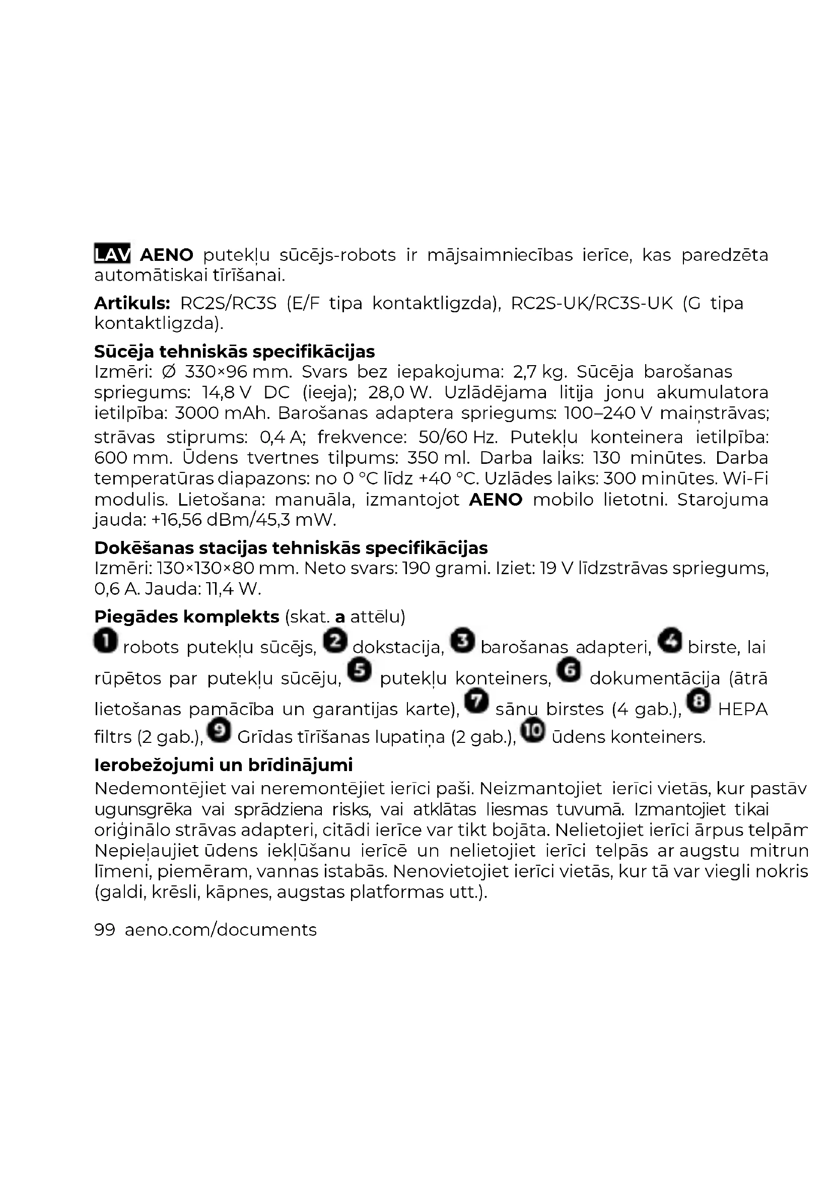 ASBISc пайдаланушыларға алдын ала ескертусіз құрылғыны өзгертуге және осы құжатқа өзгертулер мен өзгертулер енгізуге құқығын өзіне қалдырады. Кепілдік мерзімі және қызмет мерзімі – өнімді сатып алған күннен бастап 2 жыл. Өндіруші туралы мәліметтер: ASBISc Enterprises PLC, Iapetou, 1, Agios Athanasios, 4101, Limassol, Cyprus (Кипр). Қытайда жасалған. Құрылыстың ағымдағы мәліметтері мен егжей-тегі сипаттамасы, сондай-ақ қосу нұсқалары, сертификаттар, сапа мен кепілдікке қатысты шағымдарды қабылдайтын компаниялар туралы ақпарат үйлестіруі үшін қол жеткізді aeno.com/documents. Барлық аталған сауда белгілері мен олардың атаулары олардың тиісті иелерінің меншігі болып табылады.99 aeno.com/documents LAV AENO putekļu sūcējs-robots ir mājsaimniecības ierīce, kas paredzēta automātiskai tīrīšanai. Artikuls: RC2S/RC3S (E/F tipa kontaktligzda), RC2S-UK/RC3S-UK (G tipa kontaktligzda). Sūcēja tehniskās specifikācijas Izmēri: Ø 330×96 mm. Svars bez iepakojuma: 2,7 kg. Sūcēja barošanas spriegums: 14,8 V DC (ieeja); 28,0 W. Uzlādējama litija jonu akumulatora ietilpība: 3000 mAh. Barošanas adaptera spriegums: 100–240 V maiņstrāvas; strāvas stiprums: 0,4 A; frekvence: 50/60 Hz. Putekļu konteinera ietilpība: 600 mm. Ūdens tvertnes tilpums: 350 ml. Darba laiks: 130 minūtes. Darba temperatūras diapazons: no 0 °C līdz +40 °C. Uzlādes laiks: 300 minūtes. Wi-Fi modulis. Lietošana: manuāla, izmantojot AENO mobilo lietotni. Starojuma jauda: +16,56 dBm/45,3 mW. Dokēšanas stacijas tehniskās specifikācijas Izmēri: 130×130×80 mm. Neto svars: 190 grami. Iziet: 19 V līdzstrāvas spriegums, 0,6 A. Jauda: 11,4 W. Piegādes komplekts (skat. a attēlu) robots putekļu sūcējs, dokstacija, barošanas adapteri, birste, lai rūpētos par putekļu sūcēju, putekļu konteiners, dokumentācija (ātrā lietošanas pamācība un garantijas karte), sānu birstes (4 gab.), HEPA filtrs (2 gab.), Grīdas tīrīšanas lupatiņa (2 gab.), ūdens konteiners. Ierobežojumi un brīdinājumi Nedemontējiet vai neremontējiet ierīci paši. Neizmantojiet ierīci vietās, kur pastāv ugunsgrēka vai sprādziena risks, vai atklātas liesmas tuvumā. Izmantojiet tikai oriģinālo strāvas adapteri, citādi ierīce var tikt bojāta. Nelietojiet ierīci ārpus telpām. Nepieļaujiet ūdens iekļūšanu ierīcē un nelietojiet ierīci telpās ar augstu mitruma līmeni, piemēram, vannas istabās. Nenovietojiet ierīci vietās, kur tā var viegli nokrist (galdi, krēsli, kāpnes, augstas platformas utt.).aeno.com/documents 100 Tīrītājam ir vairāki sensori: lidars , kas atrodas uz tīrītāja korpusa virsmas , un sensori uz bufera . Neļaujiet svešķermeņiem nokrist uz sensoriem. Tīrīšanas laikā rūpējieties par bērnu un vecāka gadagājuma cilvēku drošību, lai izvairītos no traumām. Ja uzlādes laikā putekļsūcēja korpuss kļūst pārāk karsts, pārtrauciet uzlādi. Neizmantojiet putekļu sūcēja akumulatoru kopā ar citām ierīcēm. Neietaisiet īssavienojumu akumulatora spailēs un neizjauciet to. Izslēdziet ierīces strāvas padevi, ja tā ilgstoši nedarbojas. Lai putekļsūcējs darbotos pēc grafika, tam vienmēr jābūt ieslēgtam un uzlādētam. Uzlāde pirms darba uzsākšanas Pirms darba uzsākšanas noņemiet aizbāžņus no putekļu savācēja korpusa (skat. b attēlu). Uzstādiet sānu birstes (skat. ilustrāciju c). Savienojiet dokstaciju ar strāvas kontaktligzdu, izmantojot strāvas adapteri (skatīt d attēlu). Iespraudiet strāvas adapteri strāvas kontaktligzdā un ievietojiet strāvas adaptera kontaktdakšu kontaktligzdā uz dokstacijas korpusa. Ņemiet putekļu sūcēju par tā korpusu un salāgojiet tā kontaktus apakšā starp sānu birstēm ar dokstacijas kontaktiem . Ja putekļsūcējs robots ir pareizi novietots, mirgo gaismas diode uz dokstacijas un uzpildes poga uz robota. Kad uzlāde ir pabeigta, robota uzlādes poga vienmēr būs ieslēgta. Pirmā uzlāde no dokstacijas ilgst 6,5 stundas. BRĪDINĀJUMS! Dokēšanas stacija jāuzstāda pie sienas (sk. d attēlu). Noņemiet visus priekšmetus 0,5 metru attālumā pa kreisi un pa labi no stacijas un 1,5 metru attālumā tās priekšā. Sūcēja vadība, izmantojot uz korpusa esošās pogas Lai sāktu darbu, ieslēdziet START/STOP pogu uz tīrītāja korpusa (skatīt e attēlu). Vēlreiz nospiediet START/STOP pogu, lai apturētu ierīci. Pēc pogas "BASE" nospiešanas putekļsūcējs atgriežas dokstacijā, lai to uzlādētu.101 aeno.com/documents BRĪDINĀJUMS! Ja akumulatora uzlādes līmenis ir pārāk zems, robotizētais putekļu sūcējs automātiski apstājas un atgriežas dokstacijā, lai to uzlādētu. Sūcēja tālvadības pults Putekļsūcēju var vadīt no AENO mobilās lietotnes. BRĪDINĀJUMS! Pārliecinieties, vai viedtālrunis ir savienots ar 2,4 GHz Wi-Fi tīklu.