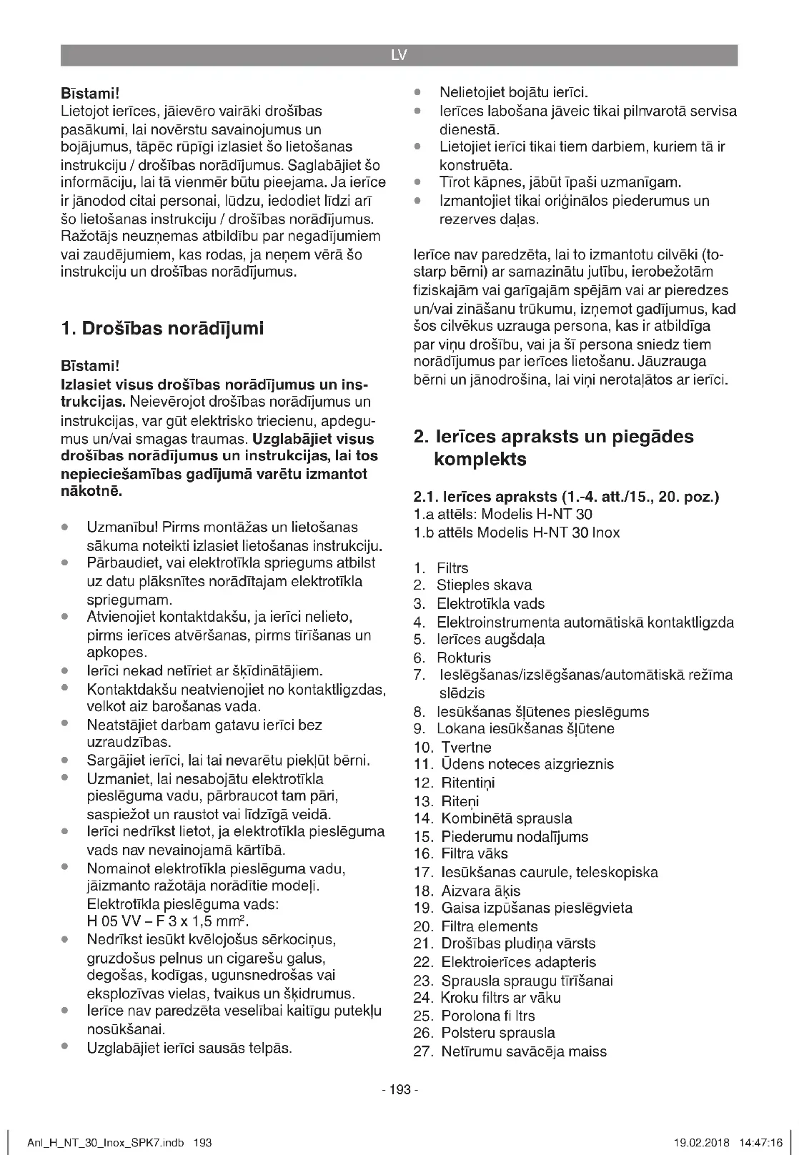 pirkuma dokumentu vai citus jaunas ierīces pirkuma pierādījumus. Ierīcēm, kas tiek nosūtītas bez atbilstīgiem pierādījumiem vai datu plāksnītes, netiek piemērotas tiesības uz garantiju, jo nav iespējama klasifi cēšana. Ja ierīces defekts ir iekļauts mūsu garantijas pakalpojumos, jūs nekavējoties saņemsiet salabotu vai jaunu ierīci. Atgādinām, ka attiecībā uz dilstošajām, patēriņa un brāķētajām detaļām saskaņā ar šajā lietošanas instrukcijā minēto informāciju par apkalpošanu ir spēkā garantijas ierobežojumi. Anl_H_NT_30_Inox_SPK7.indb 200Anl_H_NT_30_Inox_SPK7.indb 200 19.02.2018 14:47:1619.02.2018 14:47:16LT