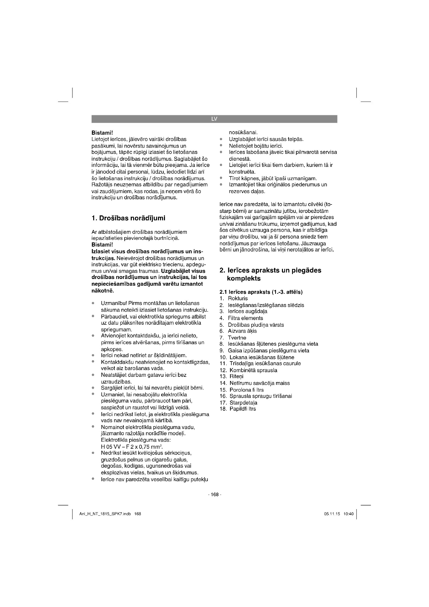Uzmanību! Putekļu sūcēju mitrai un sausai tīrīšanai nekad nelietojiet bez fi ltriem! Filtriem vienmēr jābūt cieši nostiprinātiem! Anl_H_NT_1815_SPK7.indb 169Anl_H_NT_1815_SPK7.indb 169 05.11.15 10:4005.11.15 10:40LV