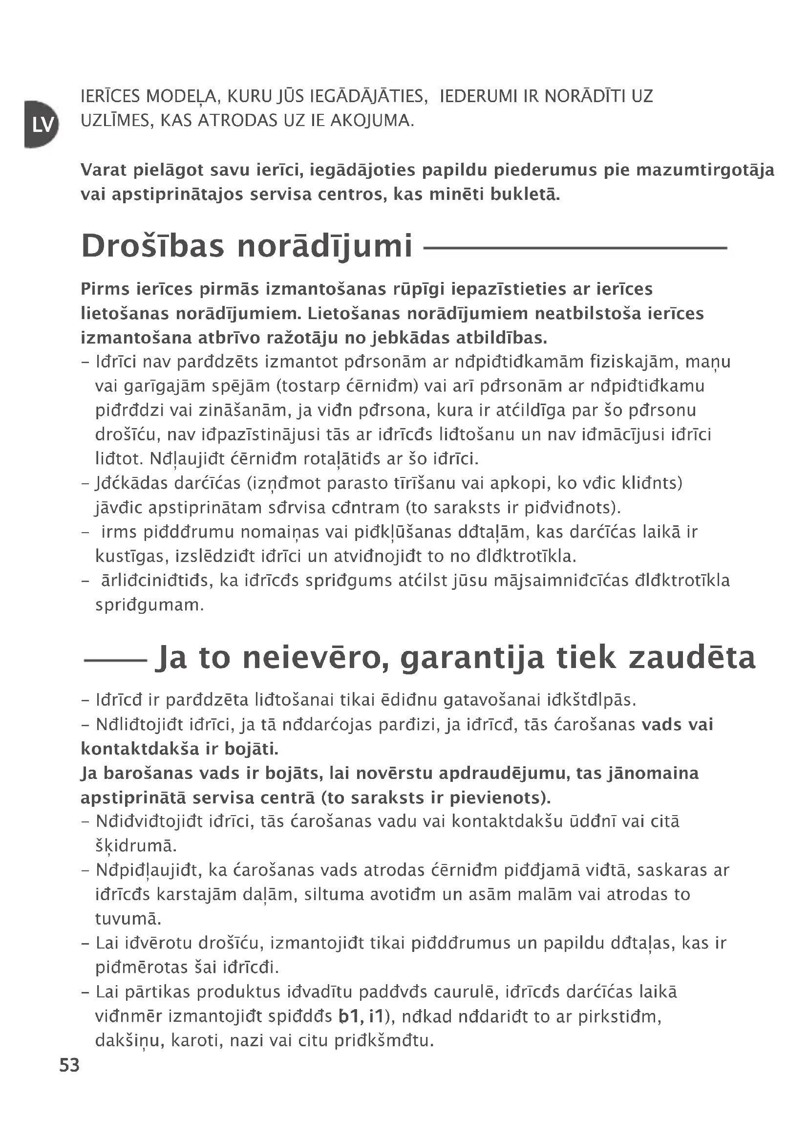 sąrašą aptarnavimo knygelėje). Elektroninis gaminys, kurio galiojimo laikas baigėsi Mąstykime apie aplinką Šiame aparate yra įvairių vertingų arba tinkamų perdirbti medžiagų. Pristatykite jas į surinkimo punktą perdirbti. Pakuotės medžiagų ir aparato šalinimas Pakuotę sudaro tik aplinkai nekenksmingos medžiagos, kurias galima išmesti pagal galiojančias perdirbimo nuostatas. Norėdami grąžinti aparatą perdirbti, kreipkitės į atitinkamą savo apylinkės tarnybą.IERĪCES MODEĻA, KURU JŪS IEGĀDĀJĀTIES, PIEDERUMI IR NORĀDĪTI UZ UZLĪMES, KAS ATRODAS UZ IEPAKOJUMA. Varat pielāgot savu ierīci, iegādājoties papildu piederumus pie mazumtirgotāja vai apstiprinātajos servisa centros, kas minēti bukletā. Drošības norādījumi Pirms ierīces pirmās izmantošanas rūpīgi iepazīstieties ar ierīces lietošanas norādījumiem. Lietošanas norādījumiem neatbilstoša ierīces izmantošana atbrīvo ražotāju no jebkādas atbildības. - Ierīci nav paredzēts izmantot personām ar nepietiekamām fiziskajām, maņu vai garīgajām spējām (tostarp bērniem) vai arī personām ar nepietiekamu pieredzi vai zināšanām, ja vien persona, kura ir atbildīga par šo personu drošību, nav iepazīstinājusi tās ar ierīces lietošanu un nav iemācījusi ierīci lietot. Neļaujiet bērniem rotaļāties ar šo ierīci. - Jebkādas darbības (izņemot parasto tīrīšanu vai apkopi, ko veic klients) jāveic apstiprinātam servisa centram (to saraksts ir pievienots). - Pirms piederumu nomaiņas vai piekļūšanas detaļām, kas darbības laikā ir kustīgas, izslēdziet ierīci un atvienojiet to no elektrotīkla. - Pārliecinieties, ka ierīces spriegums atbilst jūsu mājsaimniecības elektrotīkla spriegumam. Ja to neievēro, garantija tiek zaudēta - Ierīce ir paredzēta lietošanai tikai ēdienu gatavošanai iekštelpās. - Nelietojiet ierīci, ja tā nedarbojas pareizi, ja ierīce, tās barošanas vads vai kontaktdakša ir bojāti. Ja barošanas vads ir bojāts, lai novērstu apdraudējumu, tas jānomaina apstiprinātā servisa centrā (to saraksts ir pievienots). - Neievietojiet ierīci, tās barošanas vadu vai kontaktdakšu ūdenī vai citā šķidrumā. - Nepieļaujiet, ka barošanas vads atrodas bērniem pieejamā vietā, saskaras ar ierīces karstajām daļām, siltuma avotiem un asām malām vai atrodas to tuvumā. - Lai ievērotu drošību, izmantojiet tikai piederumus un papildu detaļas, kas ir piemērotas šai ierīcei. - Lai pārtikas produktus ievadītu padeves caurulē, ierīces darbības laikā vienmēr izmantojiet spiedes ( b1, i1), nekad nedariet to ar pirkstiem, dakšiņu, karoti, nazi vai citu priekšmetu.