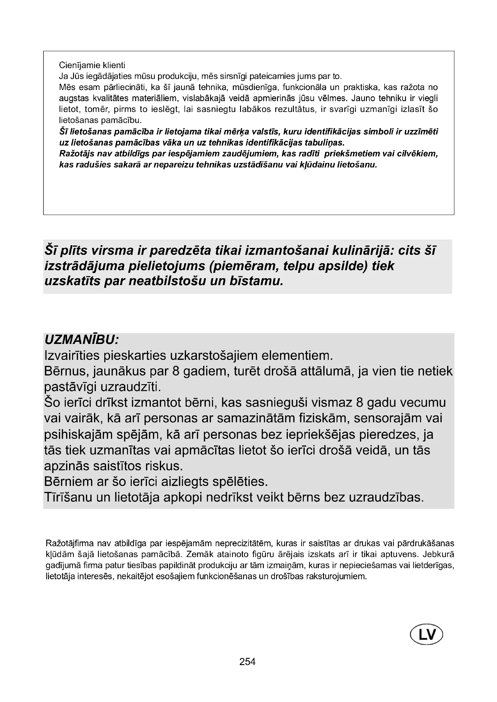 Parimate tulemuste saavutamiseks on antud seadet enne tehasest väljasaatmist testinud ja seadistanud kogenud ning kvalifitseeritud spetsialistid. Originaalvaruosasid saab seadmele muretseda ainult meie firma teeninduskeskustest ja erikauplustest. Iga seadistust ja remonti tuleb teostada suure ettevaatlikkuse ning tähelepanuga ning ainult kvalifitseeritud personali abil. Sellepärast soovitame me probleemide esinemisel alati pöörduda müüja poole, kellelt te seadme ostsite või siis lähimasse teeniduskeskusesse, näidates ära teie poolt soetatud seadme margi, mudeli, seerianumbri ja rikketüübi. Vastavad andmed on trükitud andmeplaadile (etiketile), mis asub seadme alumises osas, samuti andmeplaadil (etiketil), mis on pakendikarbis. Antud informatsioon võimaldab tehnilisel konsultandil valmistada ette vajalikud varuosad ja tagada tulevikus hooldustööde õigeaegse ja täpse teostamise. Soovitame teil need andmed allpool esitatud kujul üles kirjutada, et need oleksid vajadusel alati käepärast. MARK: ....................................................................... MUDEL: ....................................................................... SEERIA: ....................................................................... Seade on tähistatud Euroopa Parlamendi ja nõukogu elektri- ja elektroonikaseadmete jäätmete direktiivi 2002/96/EÜ nõuete kohaselt. Need juhised kehtivad üle kogu Euroopa elektri- ja elektroonikaseadmete tagastamisele ja ümbertöötlemisele.254 UZMANĪBU: Izvairīties pieskarties uzkarstošajiem elementiem. Bērnus, jaunākus par 8 gadiem, turēt drošā attālumā, ja vien tie netiek pastāvīgi uzraudzīti. Šo ierīci drīkst izmantot bērni, kas sasnieguši vismaz 8 gadu vecumu vai vairāk, kā arī personas ar samazinātām fiziskām, sensorajām vai psihiskajām spējām, kā arī personas bez iepriekšējas pieredzes, ja tās tiek uzmanītas vai apmācītas lietot šo ierīci drošā veidā, un tās apzinās saistītos riskus. Bērniem ar šo ierīci aizliegts spēlēties. Tīrīšanu un lietotāja apkopi nedrīkst veikt bērns bez uzraudzības. Cienījamie klienti Ja Jūs iegādājaties mūsu produkciju, mēs sirsnīgi pateicamies jums par to. Mēs esam pārliecināti, ka šī jaunā tehnika, mūsdienīga, funkcionāla un praktiska, kas ražota no augstas kvalitātes materiāliem, vislabākajā veidā apmierinās jūsu vēlmes. Jauno tehniku ir viegli lietot, tomēr, pirms to ieslēgt, lai sasniegtu labākos rezultātus, ir svarīgi uzmanīgi izlasīt šo lietošanas pamācību. Šī lietošanas pamācība ir lietojama tikai mērķa valstīs, kuru identifikācijas simboli ir uzzīmēti uz lietošanas pamācības vāka un uz tehnikas identifikācijas tabuliņas. Ražotājs nav atbildīgs par iespējamiem zaudējumiem, kas radīti priekšmetiem vai cilvēkiem, kas radušies sakarā ar nepareizu tehnikas uzstādīšanu vai kļūdainu lietošanu. Ražotājfirma nav atbildīga par iespējamām neprecizitātēm, kuras ir saistītas ar drukas vai pārdrukāšanas kļūdām šajā lietošanas pamācībā. Zemāk atainoto figūru ārējais izskats arī ir tikai aptuvens. Jebkurā gadījumā firma patur tiesības papildināt produkciju ar tām izmaiņām, kuras ir nepieciešamas vai lietderīgas, lietotāja interesēs, nekaitējot esošajiem funkcionēšanas un drošības raksturojumiem. Šī plīts virsma ir paredzēta tikai izmantošanai kulinārijā: cits šī izstrādājuma pielietojums (piemēram, telpu apsilde) tiek uzskatīts par neatbilstošu un bīstamu.255