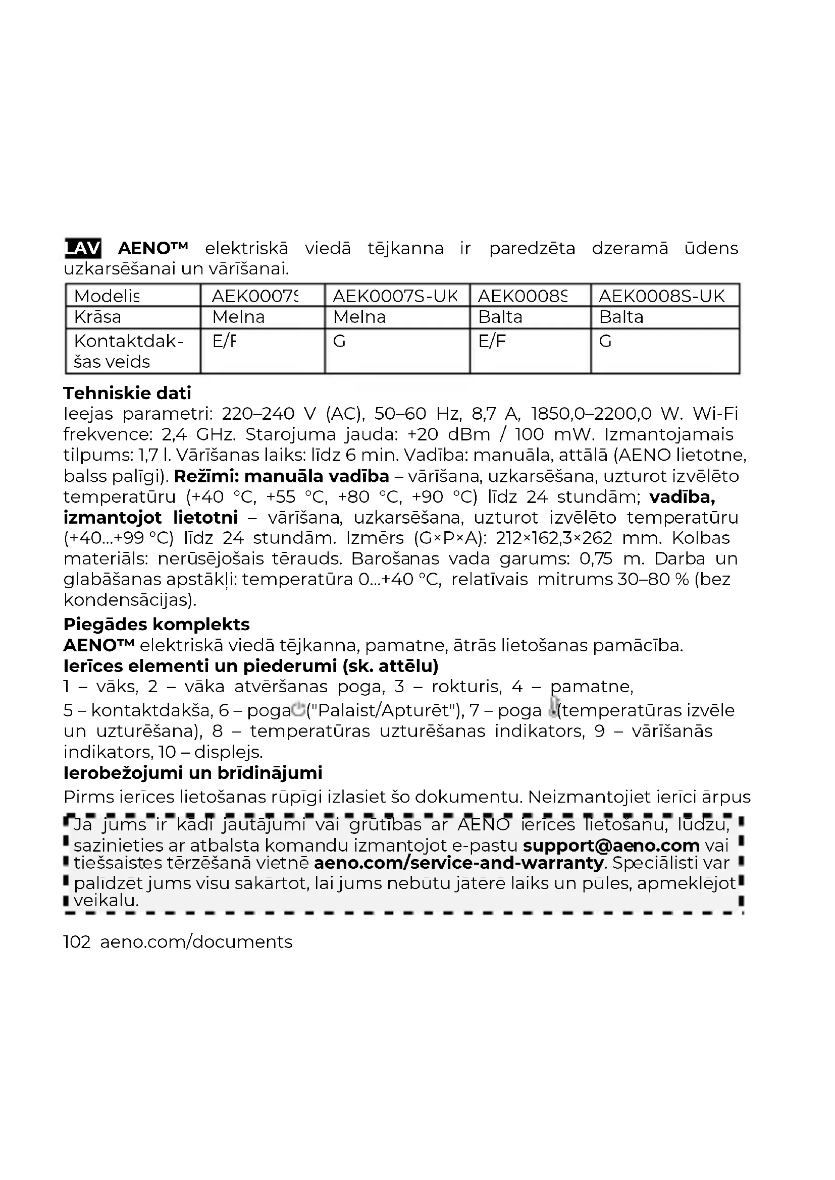 Tehniskie dati Ieejas parametri: 220–240 V (AC), 50–60 Hz, 8,7 A, 1850,0–2200,0 W. Wi-Fi frekvence: 2,4 GHz. Starojuma jauda: +20 dBm / 100 mW. Izmantojamais tilpums: 1,7 l. Vārīšanas laiks: līdz 6 min. Vadība: manuāla, attālā (AENO lietotne, balss palīgi). Režīmi: manuāla vadība – vārīšana, uzkarsēšana, uzturot izvēlēto temperatūru (+40 °C, +55 °C, +80 °C, +90 °C) līdz 24 stundām; vadība, izmantojot lietotni – vārīšana, uzkarsēšana, uzturot izvēlēto temperatūru (+40…+99 °С) līdz 24 stundām. Izmērs (G×P×A): 212×162,3×262 mm. Kolbas materiāls: nerūsējošais tērauds. Barošanas vada garums: 0,75 m. Darba un glabāšanas apstākļi: temperatūra 0…+40 °C, relatīvais mitrums 30–80 % (bez kondensācijas). Piegādes komplekts AENO™ elektriskā viedā tējkanna, pamatne, ātrās lietošanas pamācība. Ierīces elementi un piederumi (sk. attēlu) 1 – vāks, 2 – vāka atvēršanas poga, 3 – rokturis, 4 – pamatne, 5 – kontaktdakša, 6 – poga ("Palaist/Apturēt"), 7 – poga (temperatūras izvēle un uzturēšana), 8 – temperatūras uzturēšanas indikators, 9 – vārīšanās indikators, 10 – displejs. Ierobežojumi un brīdinājumi Pirms ierīces lietošanas rūpīgi izlasiet šo dokumentu. Neizmantojiet ierīci ārpus Ja jums ir kādi jautājumi vai grūtības ar AENO ierīces lietošanu, lūdzu, sazinieties ar atbalsta komandu izmantojot e-pastu support@aeno.com vai tiešsaistes tērzēšanā vietnē aeno.com/service-and-warranty. Speciālisti var palīdzēt jums visu sakārtot, lai jums nebūtu jātērē laiks un pūles, apmeklējot veikalu.aeno.com/documents 103 telpām. Tējkanna ir paredzēta lietošanai tikai mājsaimniecībās (mājās; pagaidu dzīvesvietās, piemēram, viesnīcās utt.; ēdināšanas telpas personālam birojos un citās līdzīgās telpās). Ierīci nav paredzēts lietot bērniem līdz 14 gadu vecumam vai personām ar ierobežotām fiziskām, garīgām vai intelektuālām spējām, ja tām nav pietiekamas pieredzes vai zināšanu par ierīces lietošanu, un ja tās nav par viņu drošību atbildīgas personas uzraudzībā. Pirms lietošanas pārliecinieties, ka tehniskajos datos norādītais nominālais spriegums un frekvence atbilst elektrotīkla parametriem. Neizmantojiet bojātu ierīci. Ierīce jāremontē kvalificētam tehniķim autorizētā servisa centrā. Neļaujiet strāvas vadam saskarties ar asiem priekšmetiem vai karstām virsmām. Neiegremdējiet kontaktdakšu, strāvas vadu, tējkannu un/vai pamatni ūdenī vai citos šķidrumos. Lai nomainītu bojātu vadu, sazinieties ar ražotāju, autorizētu servisa centru vai atbilstoši kvalificētu speciālistu, lai izvairītos no bīstamām situācijām. Uzstādiet ierīci tālu no ārējiem siltuma avotiem vai citām elektroiekārtām. Neieslēdziet tukšu tējkannu. Neatveriet tējkannas vāku, kamēr ūdens vārās, un divas minūtes pēc vārīšanās. Ielejot karstu ūdeni, esiet uzmanīgi, pārāk strauji nenovirziet tējkannu ar ūdeni. Pirms tējkannas pacelšanas pārliecinieties, ka vāks ir cieši aizvērts. Paceliet tējkannu tikai par rokturi. Nelejiet ūdeni zem "MIN" atzīmes un virs "MAX" atzīmes korpusa iekšpusē. Ja uzpildes laikā notiek pārplūde, no tējkannas var izlīt verdošs ūdens. Izmantojiet ierīci tikai ar komplektā iekļauto pamatne. Tējkanna ir paredzēta tikai ūdens uzkarsēšanai un vārīšanai. Izmantojiet apstrādātu ūdeni, lai samazinātu kaļķakmens veidošanos. Atvienojiet tējkannu no elektrotīkla, kad to nelietojat, un pirms tīrīšanas. Tīrīšanai nelietojiet ķīmiskus vai agresīvus mazgāšanas līdzekļus, abrazīvas pastas, skābes, šķīdinātājus vai metāla sūkļus. Neļaujiet bērniem lietot un/vai spēlēties ar ierīci. Sīkāka informācija ir atrodama pilnajā lietotāja rokasgrāmatā, kas pieejama lejupielādei vietnē aeno.com/documents. Gaismas diožu indikācija Indikators