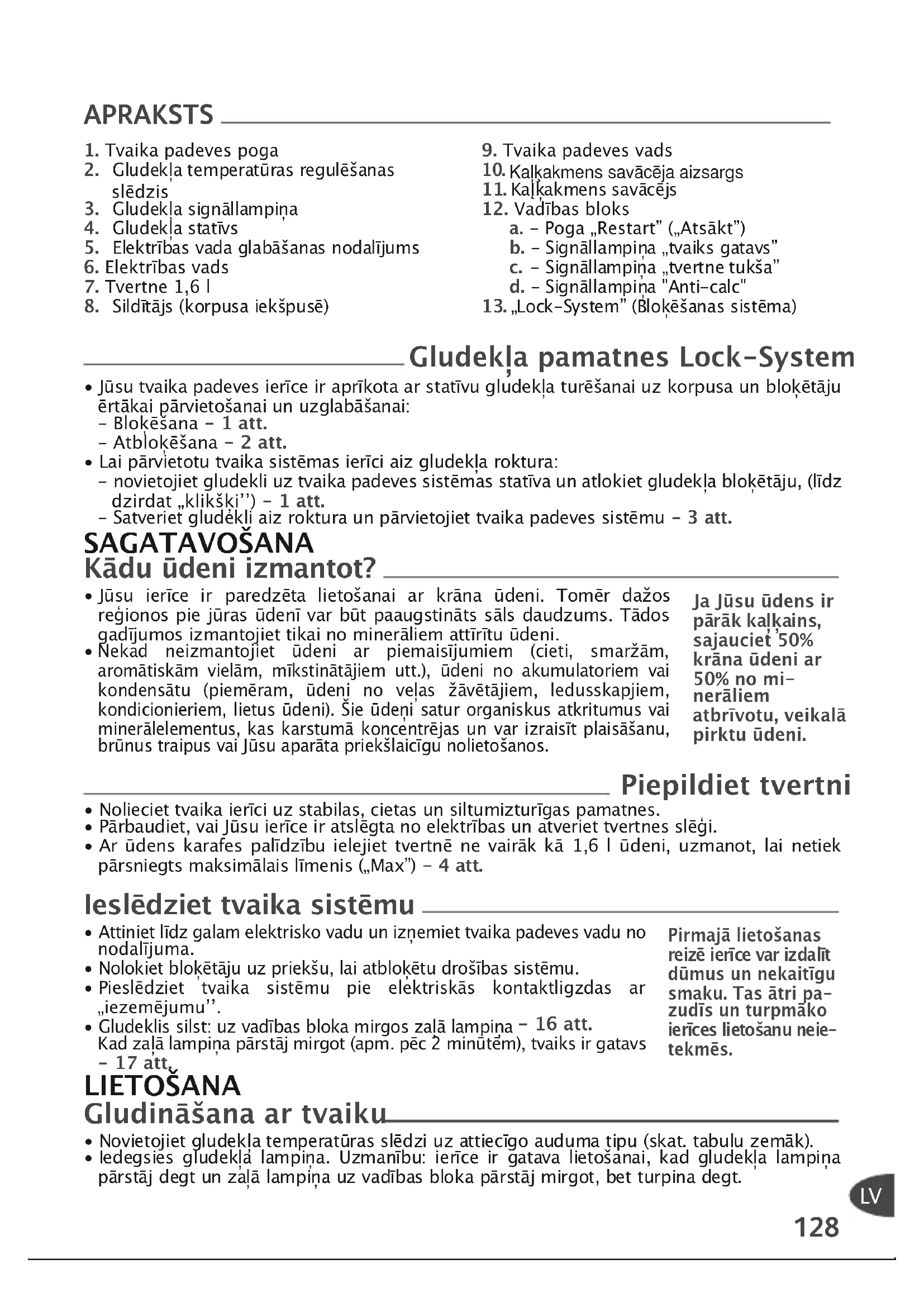 - Jūsu ierīce ir paredzēta lietošanai ar krāna ūdeni. Tomēr dažos reionos pie jūras ūdenī var būt paaugstināts sāls daudzums. Tādos gadījumos izmantojiet tikai no minerāliem attīrītu ūdeni.