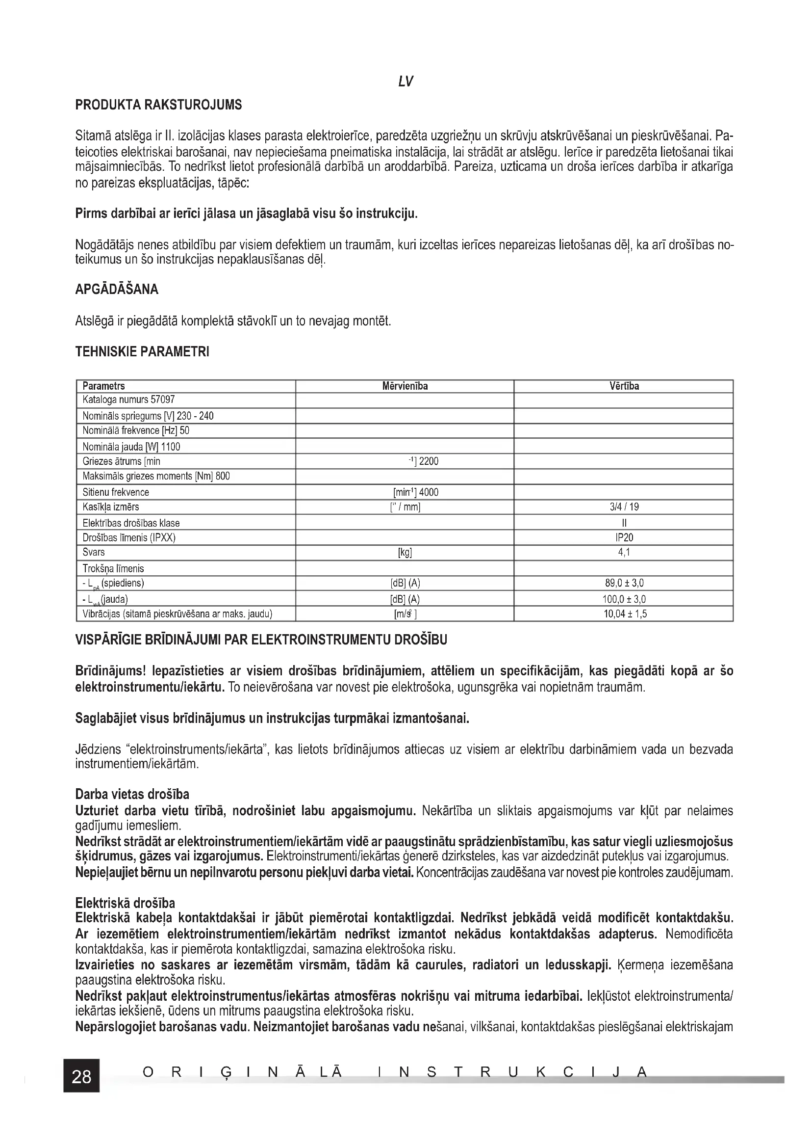 PRODUKTA RAKSTUROJUMS Sitamā atslēga ir II. izolācijas klases parasta elektroierīce, paredzēta uzgriežņu un skrūvju atskrūvēšanai un pieskrūvēšanai. Pa- teicoties elektriskai barošanai, nav nepieciešama pneimatiska instalācija, lai strādāt ar atslēgu. Ierīce ir paredzēta lietošanai tikai mājsaimniecībās. To nedrīkst lietot profesionālā darbībā un aroddarbībā. Pareiza, uzticama un droša ierīces darbība ir atkarīga no pareizas ekspluatācijas, tāpēc: Pirms darbībai ar ierīci jālasa un jāsaglabā visu šo instrukciju. Nogādātājs nenes atbildību par visiem defektiem un traumām, kuri izceltas ierīces nepareizas lietošanas dēļ, ka arī drošī bas no- teikumus un šo instrukcijas nepaklausīšanas dēļ.