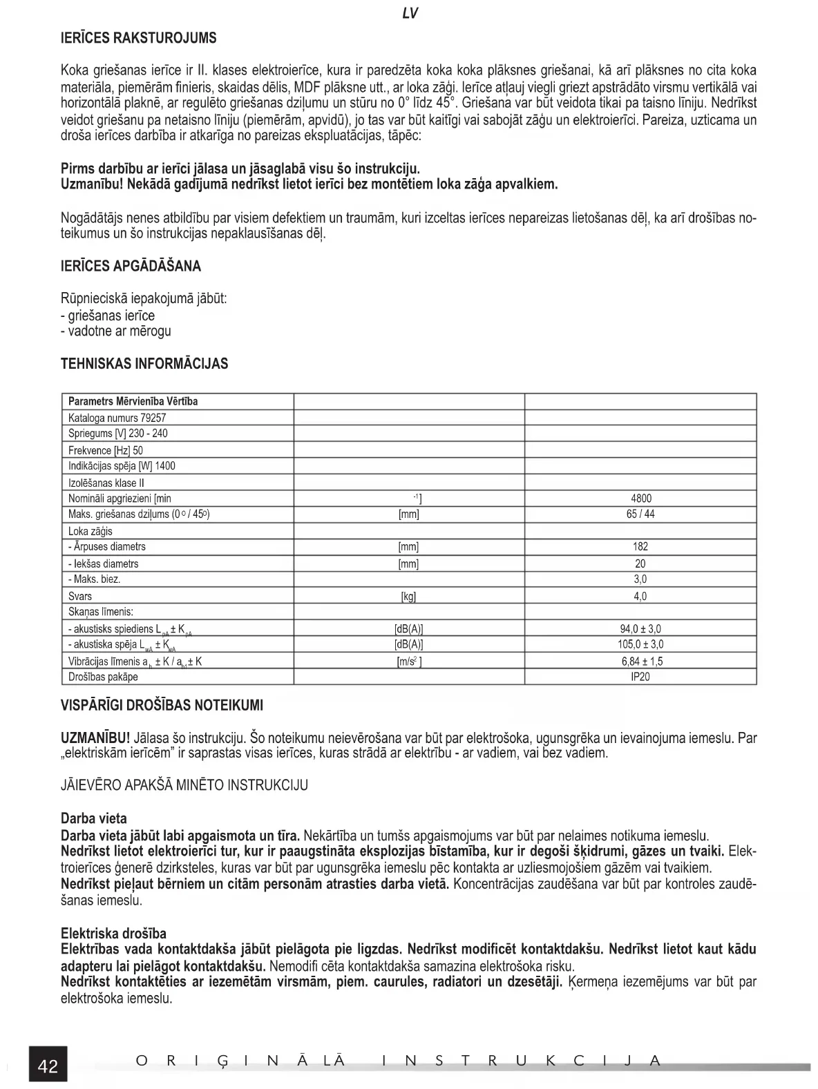 UZMANĪBU! Jālasa šo instrukciju. Šo noteikumu neievērošana var būt par elektrošoka, ugunsgrēka un ievainojuma iemeslu. Par „elektriskām ierīcēm” ir saprastas visas ierīces, kuras strādā ar elektrību - ar vadiem, vai bez vadiem. JĀIEVĒRO APAKŠĀ MINĒTO INSTRUKCIJU Darba vieta Darba vieta jābūt labi apgaismota un tīra. Nekārtība un tumšs apgaismojums var būt par nelaimes notikuma iemeslu. Nedrīkst lietot elektroierīci tur, kur ir paaugstināta eksplozijas bīstamība, kur ir degoši šķidrumi, gāzes un tvaiki. Elek- troierīces ģenerē dzirksteles, kuras var būt par ugunsgrēka iemeslu pēc kontakta ar uzliesmojošiem gāzēm vai tvaikiem. Nedrīkst pieļaut bērniem un citām personām atrasties darba vietā. Koncentrācijas zaudēšana var būt par kontroles zaudē- šanas iemeslu. Elektriska drošība Elektrības vada kontaktdakša jābūt pielāgota pie ligzdas. Nedrīkst modifi cēt kontaktdakšu. Nedrīkst lietot kaut kādu adapteru lai pielāgot kontaktdakšu. Nemodifi cēta kontaktdakša samazina elektrošoka risku. Nedrīkst kontaktēties ar iezemētām virsmām, piem. caurules, radiatori un dzesētāji. Ķermeņa iezemējums var būt par elektrošoka iemeslu.43