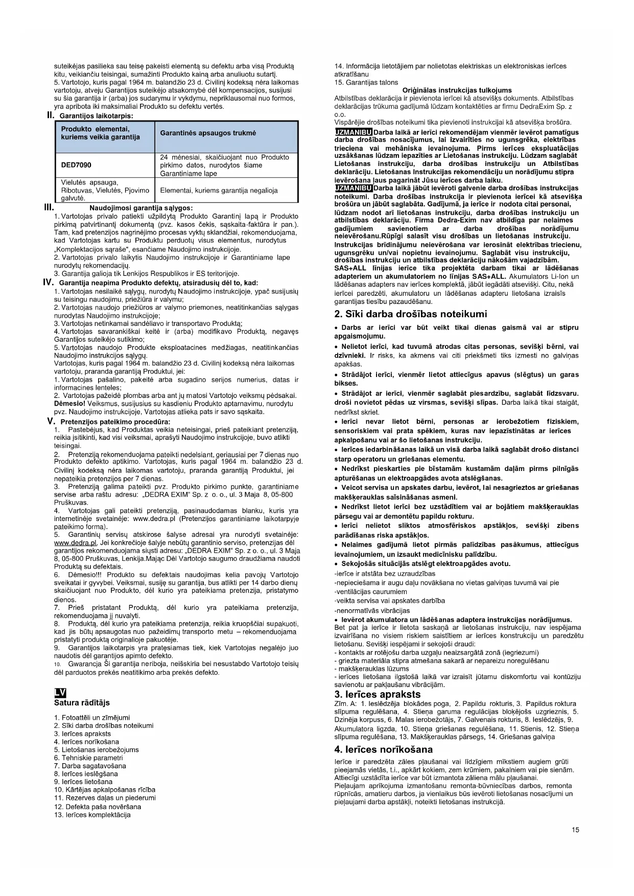 Visas tiesības pasargātas. Šis izdevums ir sargāts ar autortiesību. Lietošanas Instrukcijas kopēšana vai izplatīšana pilnīgi vai fragmentos bez Dedra Exim firmas piekrišanas ir aizliegta. Firma Dedra Exim atstāj sev tiesību veikt konstrukcijas-tehnikas izmaiņu, kā arī komplektācijas izmaiņu bez iepriekšēja paziņojuma. Šīs izmaiņas nevar būt par pamatu produkta reklamēšanai. Lietošanas instrukcija pieejama mājaslapā www.dedra.pl