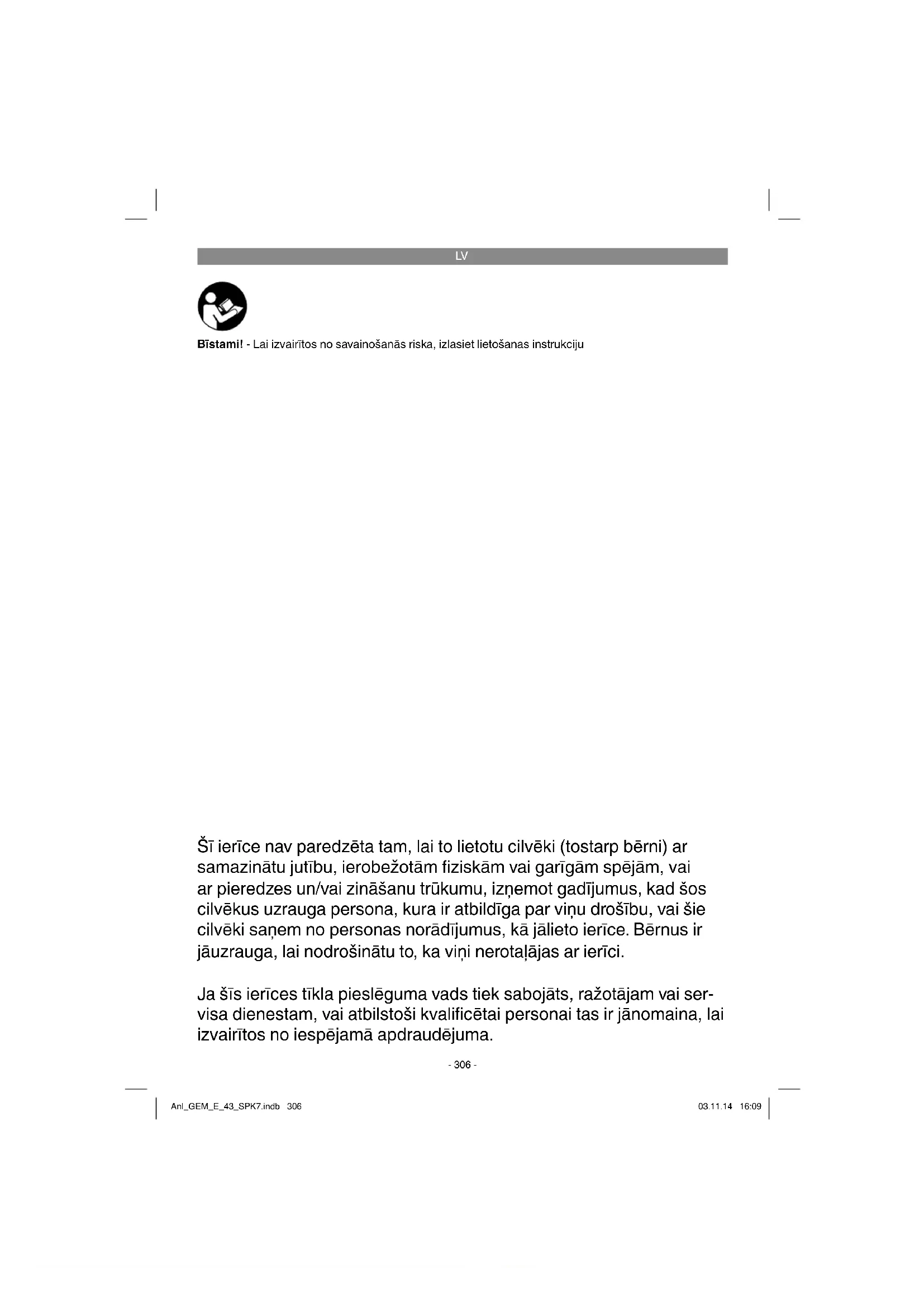 Bīstami! - Lai izvairītos no savainošanās riska, izlasiet lietošanas instrukciju Š ī ierīce nav paredzēta tam, lai to lietotu cilvēki (tostarp bērni) ar samazinātu jutību, ierobežotām fi ziskām vai garīgām spējām, vai ar pieredzes un/vai zināšanu trūkumu, izņemot gadījumus, kad šos cilvēkus uzrauga persona, kura ir atbildīga par viņu drošību, vai šie cilvēki saņem no personas norādījumus, kā jālieto ierīce. Bērnus ir jāuzrauga, lai nodrošinātu to, ka viņi nerotaļājas ar ierīci. Ja šīs ierīces tīkla pieslēguma vads tiek sabojāts, ražotājam vai ser- visa dienestam, vai atbilstoši kvalifi cētai personai tas ir jānomaina, lai izvairītos no iespējam ā apdraudējuma. Anl_GEM_E_43_SPK7.indb 306Anl_GEM_E_43_SPK7.indb 306 03.11.14 16:0903.11.14 16:09LV