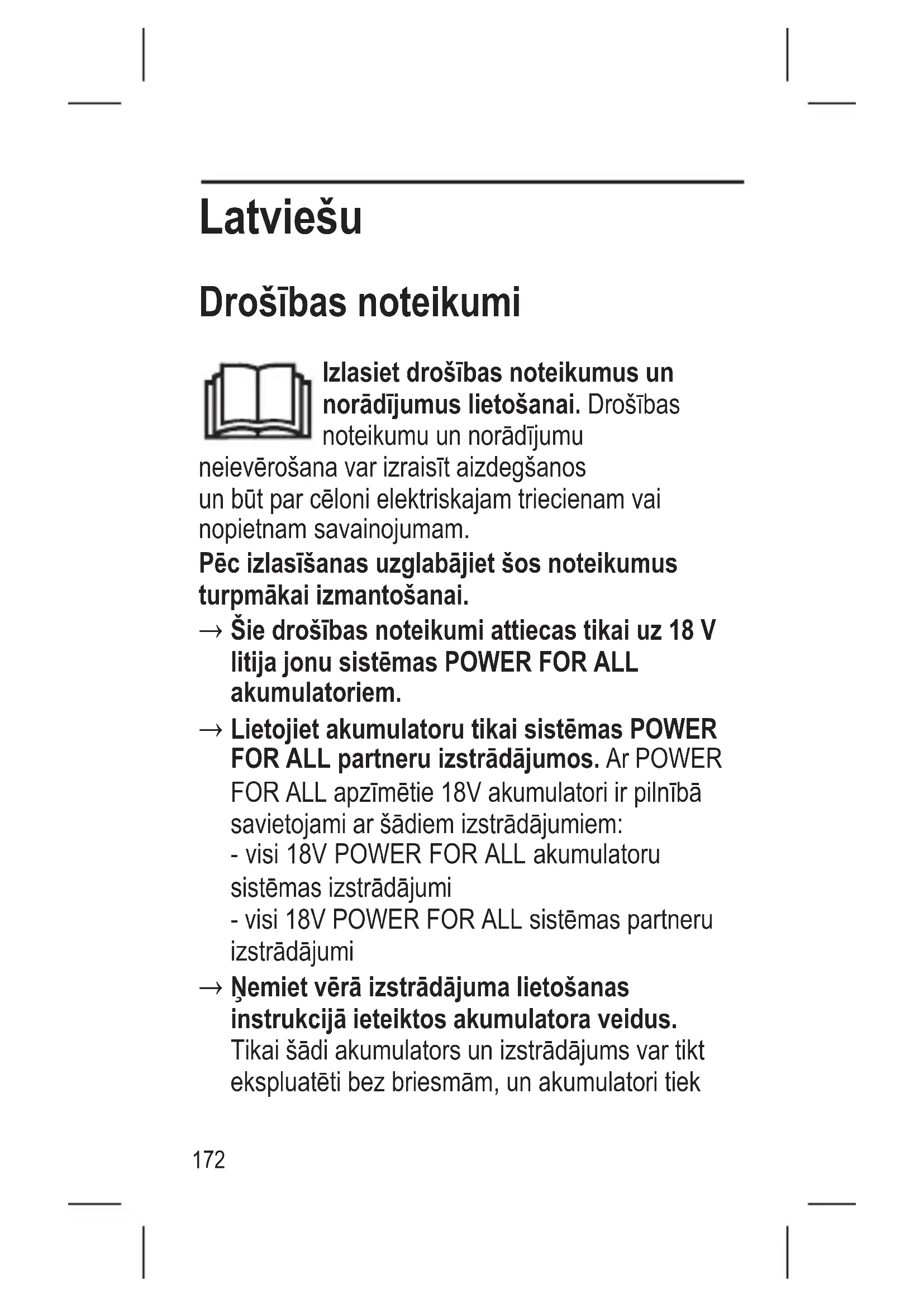 Sobivad POWER FOR ALL süsteemi akulaadijad: P4A 18-C50, P4A 18-C70, P4A 18-C100, P4A 18-C170. 171Latviešu Drošībasnoteikumi Izlasietdrošībasnoteikumusun norādījumuslietošanai.Drošības noteikumuunnorādījumu neievērošanavarizraisītaizdegšanos unbūtparcēlonielektriskajamtriecienamvai nopietnam savainojumam. Pēcizlasīšanasuzglabājietšosnoteikumus turpmākaiizmantošanai.