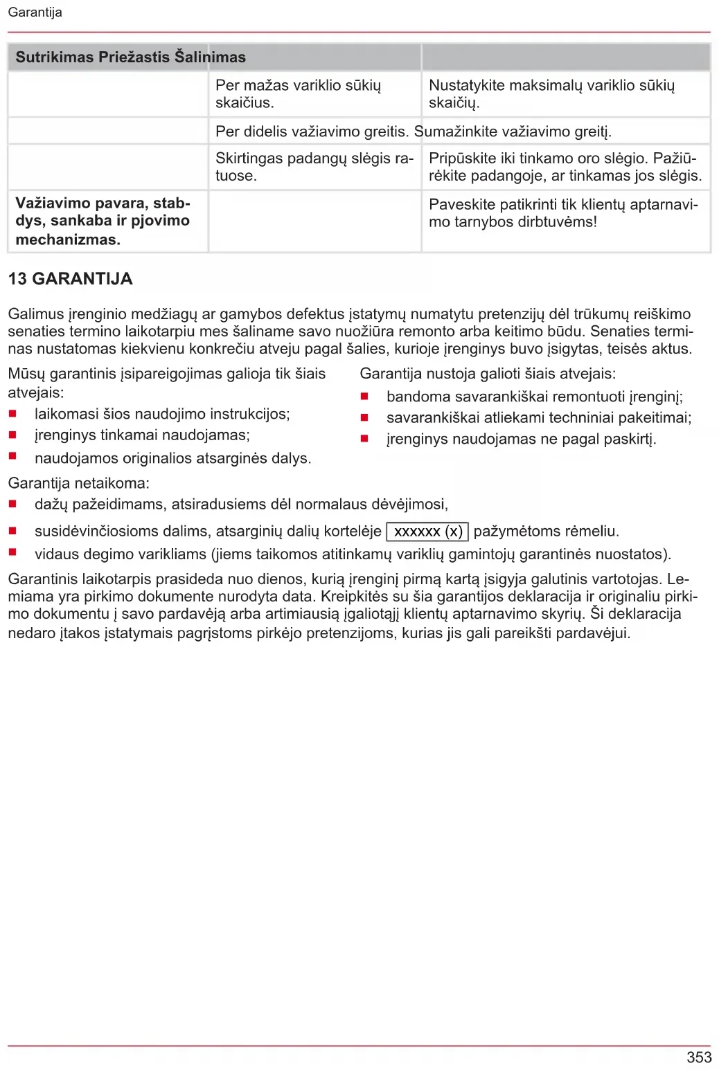 Palīdzība traucējumu gadījumā Problēma Iemesls Novēršana Piesārņots gaisa filtrs. Iztīrīt gaisa filtru (skatīt motora ražotāja lietošanas instrukciju). Nav dzirksteles. Notīrīt aizdedzes sveces, iespējams, ie- likt jaunas, pārbaudīt aizdedzes kabeli, pārbaudīt aizdedzes bloku (klientu ap- kalpošanas dienesta darbnīca). Pēc vairākkārtējiem mēģinā- jumiem iedarbināt motoru, motora telpā ir pārāk daudz degvielas. Izņemiet un izžāvējiet aizdedzes sveci. Nestrādā palaidējs. Tukšs vai vājš akumulators. Uzlādējiet akumulatoru. Nestrādā vadītāja sēdekļa drošības slēdzis. Kārtīgi apsēsties vadītāja vietā; slēdža defekts. Nestrādā bremžu pedāļa dro- šības slēdzis. Nospiest bremžu pedāli līdz galam. Pieslēgts pļaušanas mehā- nisms. Izslēdziet pļaušanas mehānismu. Veiciet akumulatora (+) ka- beļa izolāciju. Pārbaudiet izolāciju, ja nepieciešams, nomainiet. Samazināta motora jau- da. Pārāk gara vai īsa zāle. Noregulējiet pļaušanas augstumu; atbrī- vojiet pļaušanas mehānismu, pabraucot nedaudz atpakaļ. Piesārņots gaisa filtrs. Iztīrīt gaisa filtru (skatīt motora ražotāja lietošanas instrukciju). Nepareizi karburatora iestatī- jumi. Lūdziet pārbaudīt iestatījumus (klientu apkalpošanas dienesta darbnīca). Ļoti nolietots asmens. Nomainiet asmeni (klientu apkalpoša- nas dienesta darbnīca). Pārāk liels braukšanas āt- rums. Samazināt braukšanas ātrumu. Mauriņa traktors stipri vibrē. Pļaušanas mehānisms ir bo- jāts. Pārbaudiet pļaušanas mehānismu (klientu apkalpošanas dienesta darbnī- ca). Mauriņa traktors ne- brauc. Modelim ar hidrostatisko transmisiju: nav piedziņas. Pārslēdziet apvada sviru darba režīmā. Nevienmērīgs griezums. Nolietots, truls asmens. Nomainīt vai uzasināt asmeni. Līdzsva- rojiet nodilušus asmeņus (klientu apkal- pošanas dienesta darbnīca)! Nepareizais pļaušanas augstums. Izlabot pļaušanas augstumu. Pārāk mazs motora apgrie- zienu skaits. Izvēlēties maksimālo motora apgriezie- nu skaitu.371 Garantija Problēma Iemesls Novēršana Pārāk liels braukšanas āt- rums. Samazināt braukšanas ātrumu. Riteņos atšķiras riepu spie- diens. Palielināt gaisa spiedienu līdz pareiza- jam. Izlabot, lai iegūtu riepās pareizo spiedienu. Transmisija, bremzes, sa- kabe un pļaušanas mehā- nisms. Drīkst pārbaudīt tikai klientu apkalpoša- nas centrā! 13 GARANTIJA Iespējamos materiāla vai ražošanas brāķus iekārtā mēs novērsīsim atbilstoši likumā noteiktajam noil- guma termiņam attiecībā uz garantijas prasībām, paturot tiesības izvēlēties remontu vai jaunas preces piegādi. Noilguma termiņš tiek noteikts, vadoties pēc tās valsts spēkā esošās likumdošanas, kurā ierī- ce tika nopirkta. Mūsu garantijas pakalpojumi ir spēkā tikai tad, ja: