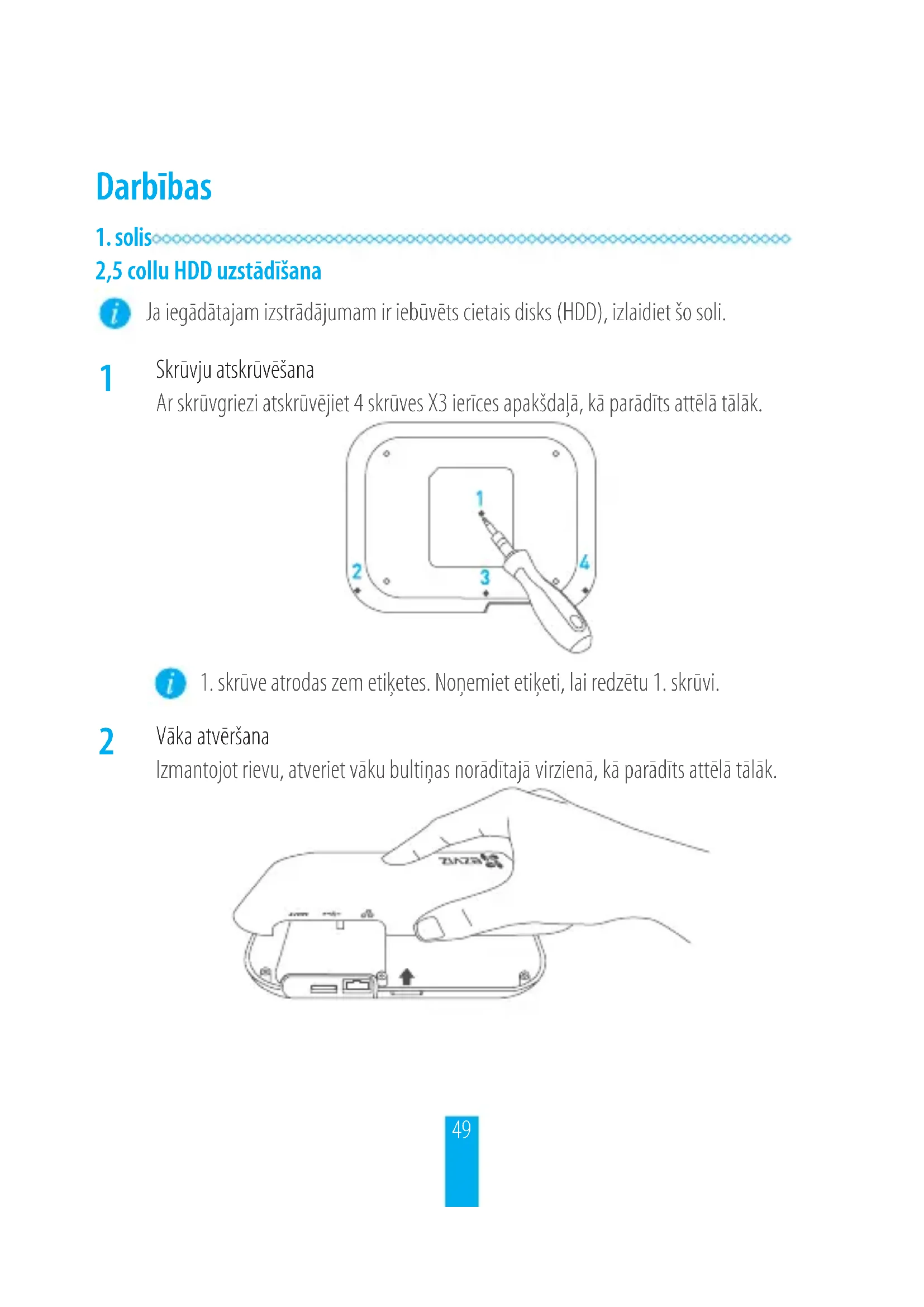 Skrūvju atskrūvēšana Ar skrūvgriezi atskrūvējiet 4skrūves X3 ierīces apakšdaļā, kā parādīts attēlā tālāk. 1.skrūve atrodas zem etiķetes. Noņemiet etiķeti, lai redzētu 1.skrūvi.