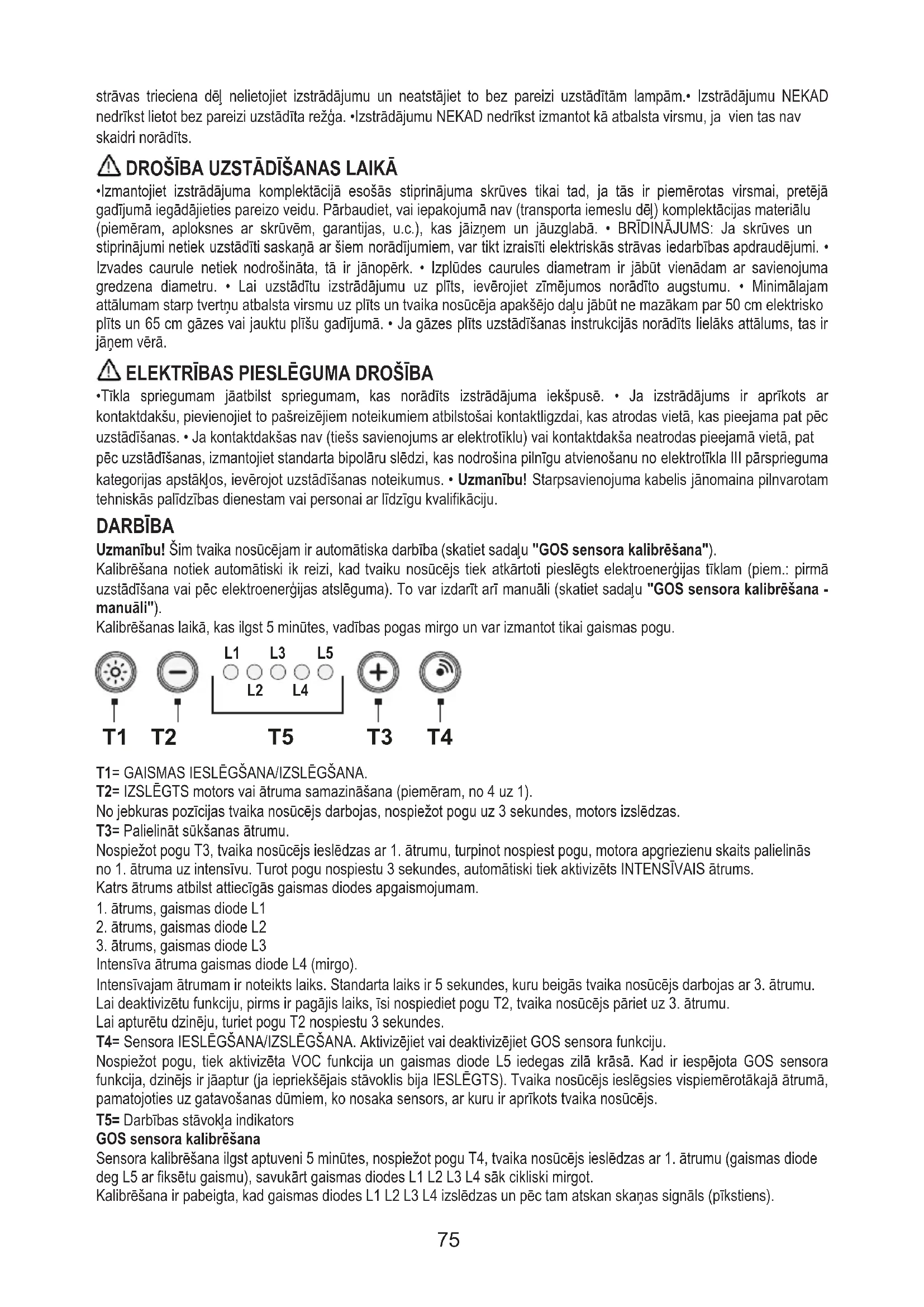 Intensīva ātruma gaismas diode L4 (mirgo). Intensīvajam ātrumam ir noteikts laiks. Standarta laiks ir 5 sekundes, kuru beigās tvaika nosūcējs darbojas ar 3. ātrumu. Lai deaktivizētu funkciju, pirms ir pagājis laiks, īsi nospiediet pogu T2, tvaika nosūcējs pāriet uz 3. ātrumu. Lai apturētu dzinēju, turiet pogu T2 nospiestu 3 sekundes. T4= Sensora IESLĒGŠANA/IZSLĒGŠANA. Aktivizējiet vai deaktivizējiet GOS sensora funkciju. Nospiežot pogu, tiek aktivizēta VOC funkcija un gaismas diode L5 iedegas zilā krāsā. Kad ir iespējota GOS sensora funkcija, dzinējs ir jāaptur (ja iepriekšējais stāvoklis bija IESLĒGTS). Tvaika nosūcējs ieslēgsies vispiemērotākajā ātrumā, pamatojoties uz gatavošanas dūmiem, ko nosaka sensors, ar kuru ir aprīkots tvaika nosūcējs. T5= Darbības stāvokļa indikators GOS sensora kalibrēšana Sensora kalibrēšana ilgst aptuveni 5 minūtes, nospiežot pogu T4, tvaika nosūcējs ieslēdzas ar 1. ātrumu (gaismas diode deg L5 ar fiksētu gaismu), savukārt gaismas diodes L1 L2 L3 L4 sāk cikliski mirgot. Kalibrēšana ir pabeigta, kad gaismas diodes L1 L2 L3 L4 izslēdzas un pēc tam atskan skaņas signāls (pīkstiens). 75Kalibrēšanas laikā ir iespējams tikai ieslēgt vai izslēgt apgaismojumu. Kalibrēšana ir nepieciešama, lai sensors, ar kuru ir aprīkots tvaika nosūcējs, darbotos pareizi, un tā var būt: automātiska: ik reizi, kad tvaika nosūcējs tiek atkal pievienots elektrotīklam (piemēram: pirmās uzstādīšanas reize vai pēc strāvas padeves pārtraukuma). manuāla: jāveic, ja tiek konstatēta neapmierinoša automātiskā darbība, un jāveic, ja virtuvē saglabājas normāli vides apstākļi. Manuālā kalibrēšana tiek aktivizēta, turot pogu T4 nospiestu 6 sekundes. Plīts virsmas izvēle Lai vislabāk izmantotu GOS funkciju, ir jāizvēlas pareizais plīts veids (gāzes – indukcijas vai elektriskā). Ja tvaika nosūcējs un GOS sensors ir izslēgti, vienlaikus nospiediet pogas T1 un T4, līdz atskan skaņas signāls (pīkstiens), atlaidiet pogas un ar sekojošu nospiešanu vai nu uz pogas T1 vai T4 varat izvēlēties vajadzīgo plīts virsmu atbilstoši šādai shēmai: Gaismas diode 1: gāzes plīts Gaismas diode 2: elektriskā plīts Gaismas diode 3: indukcijas plīts izvēlētā poga paliek izgaismota, norādot, ka izvēle ir veikta, pēc 10 sekundēm poga īsi mirgo, norādot, ka veiktā izvēle ir reģistrēta. Tauku filtra signāls Pēc 40 darbības stundām gaismas diodes L1 un L5 sāk mirgot. Kad parādās šis signāls, uzstādītais tauku filtrs ir jāmazgā. Lai atiestatītu signālu, turiet nospiestu pogu T2 3 sekundes. Ogles filtra signāls Pēc 160 darbības stundām gaismas diodes L2 un L5 sāk mirgot. Ja parādās šis ziņojums, uzstādītais ogles filtrs ir jānomaina. Lai atiestatītu signālu, turiet nospiestu pogu T3 3 sekundes. Standarta režīmā ogles filtra signāls nav aktīvs. Ja tiek izmantots filtrēšanas versijas tvaika nosūcējs, ir jāiespējo ogles filtra signāls. Ogles filtra signāla aktivizēšana: Pārslēdziet tvaika nosūcēju pozīcijā IZSLĒGTS un vienlaikus turiet nospiestas pogas T2 un T3 3sekundes (ja mirgo L2 gaismas diode, tas nozīmē, ka ogles filtrs NAV aktīvs), nospiediet pogu T3, lai aktivizētu ogles filtra signalizācijas funkciju. L2 un L5 gaismas diodes deg ar fiksētu gaismu, uzgaidiet 10 sekundes, pēc tam funkcija tiek aktivizēta, kam seko skaņas signāls (pīkstiens). Ogles filtra signāla deaktivizēšana: Pārslēdziet tvaika nosūcēju pozīcijā IZSLĒGTS un vienlaikus turiet nospiestas pogas T2 un T3 3 sekundes (ja LED L2 deg ar fiksētu gaismu, tas nozīmē, ka ir aktīvs ogles filtrs), gaismas diodes L2, L5 deg ar fiksētu gaismu, nospiežot pogu T3, gaismas diode L2 sāk mirgot, uzgaidiet 10 sekundes, pēc tam oglekļa filtra signalizācijas funkcija tiek deaktivizēta, kam seko skaņas signāls (pīkstiens).