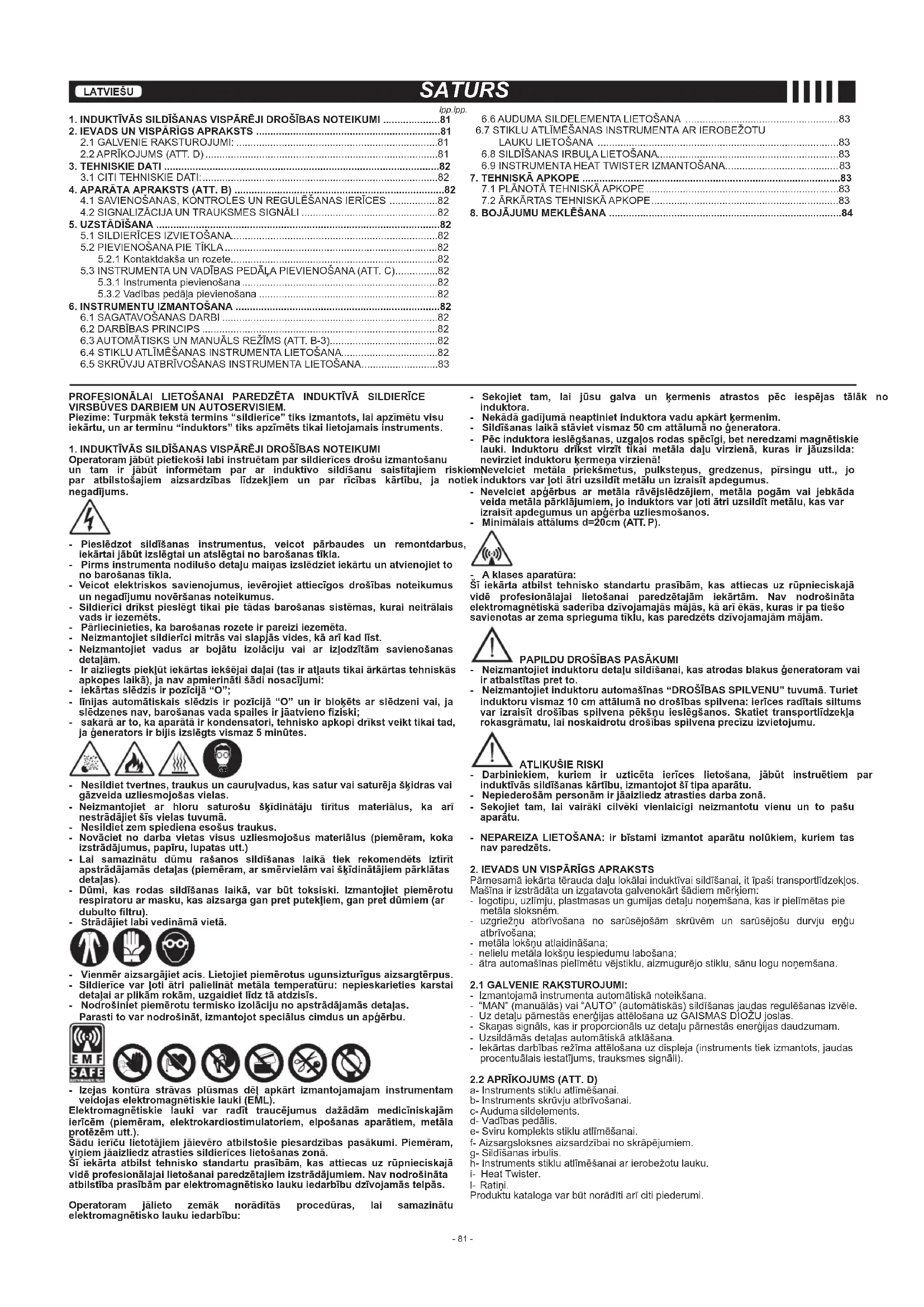 PLĀNOTOTEHNISKOAPKOPIVARVEIKTOPERATORS. Pārbaudiet barošanas vadu un instrumenta vadus. Tiem jābūt izolētiem un jābūt ideālā stāvoklī, īpaši uzmanīgi pārbaudiet locījumu vietas. Pārbaudiet instrumentu. Nelietojiet induktorus ar redzamiem izolācijas vai korpusa bojājumiem. Nomainiet bojātas instrumentu aizsargsloksnes. Sekojiet tam, lai instrumenta savienotājs būtu labi noksēts ar atbilstošu bloķēšanas sviru. Sekojiet tam, lai instrumentu savienotāji būtu tīri. Neļaujiet netīrumiem, putekļiem un skaidām iekļūt iekārtas iekšpusē. Nodrošiniet nepārtrauktu dzesēšanas gaisa cirkulāciju. Pārbaudiet, vai ventilators darbojas pareizi.