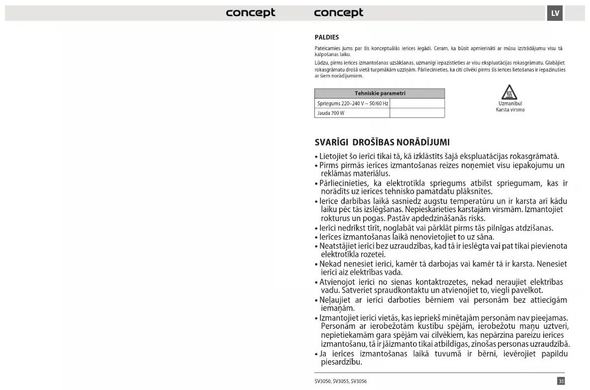 PALDIES Pateicamies jums par šīs konceptuālās ierīces iegādi. Ceram, ka būsit apmierināti ar mūsu izstrādājumu visu tā kalpošanas laiku. Lūdzu, pirms ierīces izmantošanas uzsākšanas, uzmanīgi iepazīstieties ar visu ekspluatācijas rokasgrāmatu. Glabājiet rokasgrāmatu drošā vietā turpmākām uzziņām. Pārliecinieties, ka citi cilvēki pirms šīs ierīces lietošanas ir iepazinušies ar šiem norādījumiem. Tehniskie parametri Spriegums 220–240 V ~ 50/60 Hz Jauda 700 W SVARĪGI DROŠĪBAS NORĀDĪJUMI