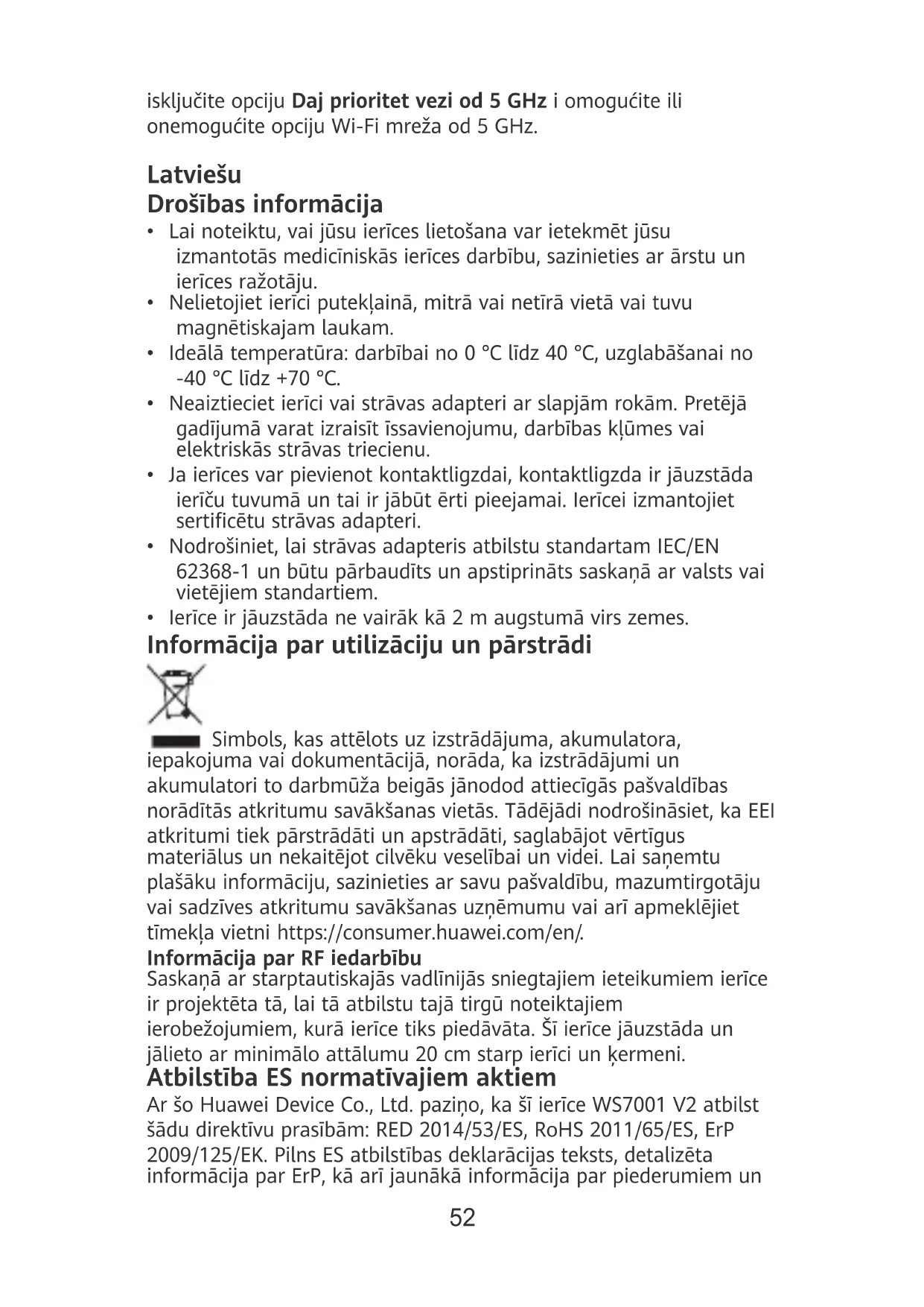 Informācija par RF iedarbību Saskaņā ar starptautiskajās vadlīnijās sniegtajiem ieteikumiem ierīce ir projektēta tā, lai tā atbilstu tajā tirgū noteiktajiem ierobežojumiem, kurā ierīce tiks piedāvāta. Šī ierīce jāuzstāda un jālieto ar minimālo attālumu 20 cm starp ierīci un ķermeni. Atbilstība ES normatīvajiem aktiem Ar šo Huawei Device Co., Ltd. paziņo, ka šī ierīce WS7001 V2 atbilst šādu direktīvu prasībām: RED 2014/53/ES, RoHS 2011/65/ES, ErP 2009/125/EK. Pilns ES atbilstības deklarācijas teksts, detalizēta informācija par ErP, kā arī jaunākā informācija par piederumiem un 52programmatūru ir pieejama šajā interneta adresē: https://consumer.huawei.com/certication. Ierobežojumi 5 GHz joslā 5150–5350 MHz frekvences ir paredzētas izmantošanai vienīgi telpās šajās valstīs: AT, BE, BG, CH, CY, CZ, DE, DK, EE, EL, ES, FI, FR, HR, HU, IE, IS, IT, LI, LT, LU, LV, MT, NL, NO, PL, PT, RO, SE, SI, SK, TR, UK(NI). Frekvenču joslas un jauda Wi-Fi 2.4 GHz: 20 dBm, Wi-Fi 5 GHz: 5150-5350 MHz: 23 dBm, 5470-5600 MHz & 5650-5725 MHz: 30 dBm Versijas atjauninājums Lai uzlabotu produkta drošību un sniegtu jums labākas lietošanas iespējas, mēs regulāri jums sūtīsim informāciju par atjauninājumiem, kad būs pieejams kāds svarīgs atjauninājums. Lietotāja licences līgums Pirms produkta lietošanas izlasiet produkta pārvaldības lapā pieejamo Lietotāja licences līgumu (HUAWEI EULA) un piekrītiet tam. Lai iegūtu papildu informāciju par pieejamības funkcijām, apmeklējiet Huawei ociālo tīmekļa vietni un izlasiet Piekļuves punkta produktu pieejamības pamācību (Accessibility Guide of Access Point Products). Norādījumi, kā iespējot un atspējot bezvadu tīklus