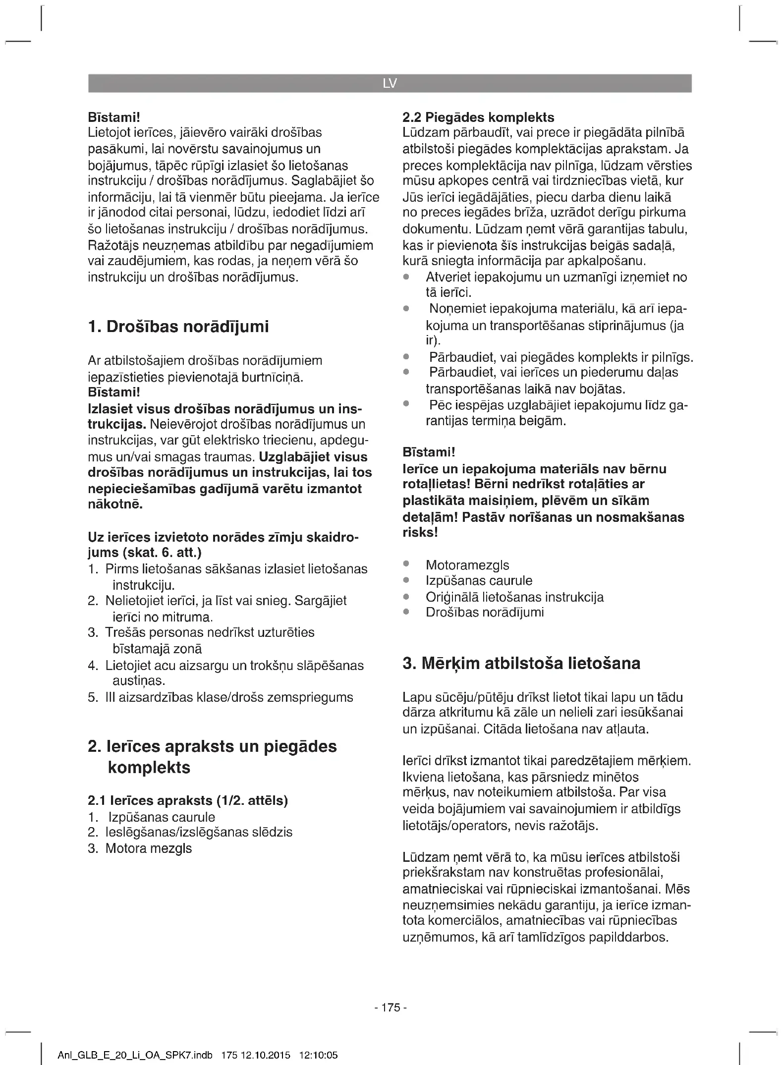 Lapu sūcēju/pūtēju drīkst lietot tikai lapu un tādu dārza atkritumu kā zāle un nelieli zari iesūkšanai un izpūšanai. Citāda lietošana nav atļauta. Ierīci drīkst izmantot tikai paredzētajiem mērķiem. Ikviena lietošana, kas pārsniedz minētos mērķus, nav noteikumiem atbilstoša. Par visa veida bojājumiem vai savainojumiem ir atbildīgs lietotājs/operators, nevis ražotājs. Lūdzam ņemt vērā to, ka mūsu ierīces atbilstoši priekšrakstam nav konstruētas profesionālai, amatnieciskai vai rūpnieciskai izmantošanai. Mēs neuzņemsimies nekādu garantiju, ja ierīce izman- tota komerciālos, amatniecības vai rūpniecības uzņēmumos, kā arī tamlīdzīgos papilddarbos. Anl_GLB_E_20_Li_OA_SPK7.indb 175 12.10.2015 12:10:05LV