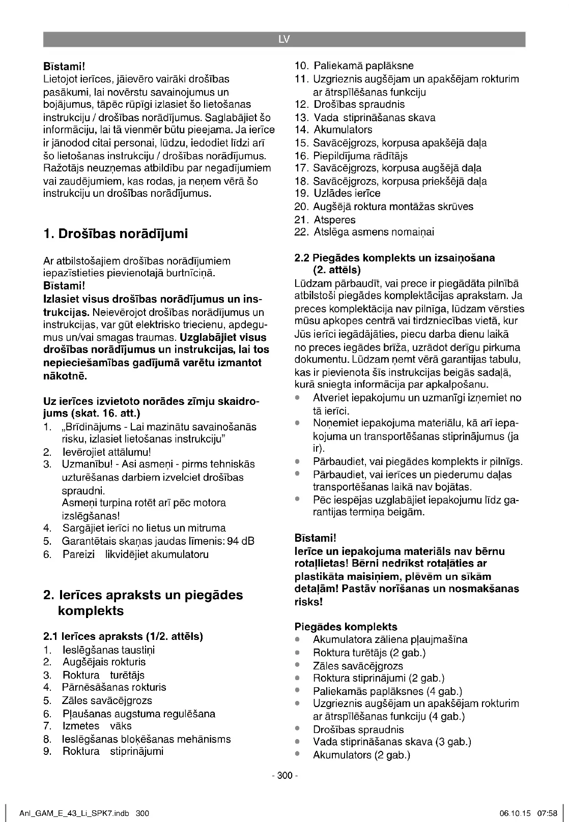 izmantošana Ierīce atrodas iepakojumā, lai izvairītos no bojājumiem transportēšanas laikā. Iepakojums ir izejmateriāls un to var izmantot atkārtoti vai nodot izejvielu apritē. Ierīce un tās piederumi ir no dažādiem materiāliem, piemēram, metāla un plastmasas. Bojātas detaļas nav sadzīves atkri- tumi. Lai nodrošinātu tehniski pareizu utilizāciju, ierīce jānodod attiecīgā savākšanas vietā. Ja Jums nav zināma šāda savākšanas vieta, jautājiet pašvaldībā. Anl_GAM_E_43_Li_SPK7.indb 305Anl_GAM_E_43_Li_SPK7.indb 305 06.10.15 07:5806.10.15 07:58LV