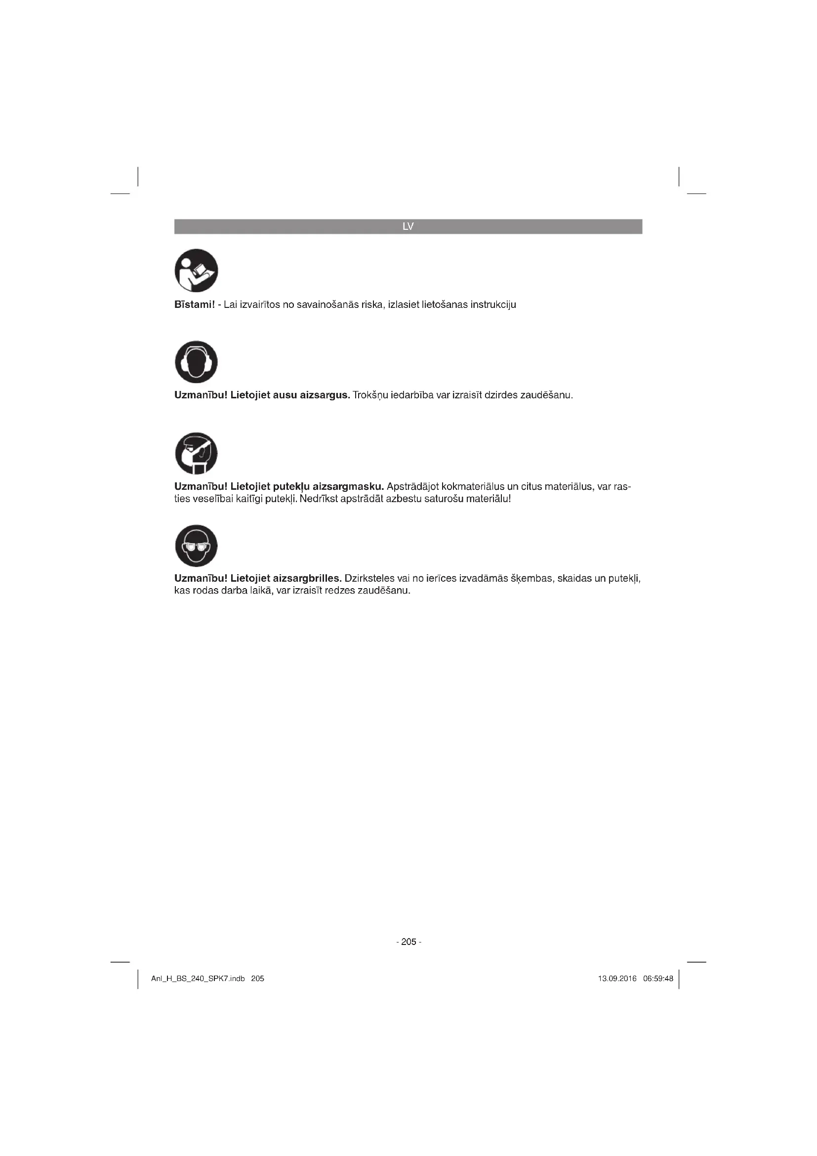 Bīstami! - Lai izvairītos no savainošanās riska, izlasiet lietošanas instrukciju Uzmanību! Lietojiet ausu aizsargus. Trokšņu iedarbība var izraisīt dzirdes zaudēšanu. Uzmanību! Lietojiet aizsargbrilles. Dzirksteles vai no ierīces izvadāmās šķembas, skaidas un putekļi, kas rodas darba laikā, var izraisīt redzes zaudēšanu. Uzmanību! Lietojiet putekļu aizsargmasku. Apstrādājot kokmateriālus un citus materiālus, var ras- ties veselībai kaitīgi putekļi. Nedrīkst apstrādāt azbestu saturošu materiālu! Anl_H_BS_240_SPK7.indb 205Anl_H_BS_240_SPK7.indb 205 13.09.2016 06:59:4813.09.2016 06:59:48LV