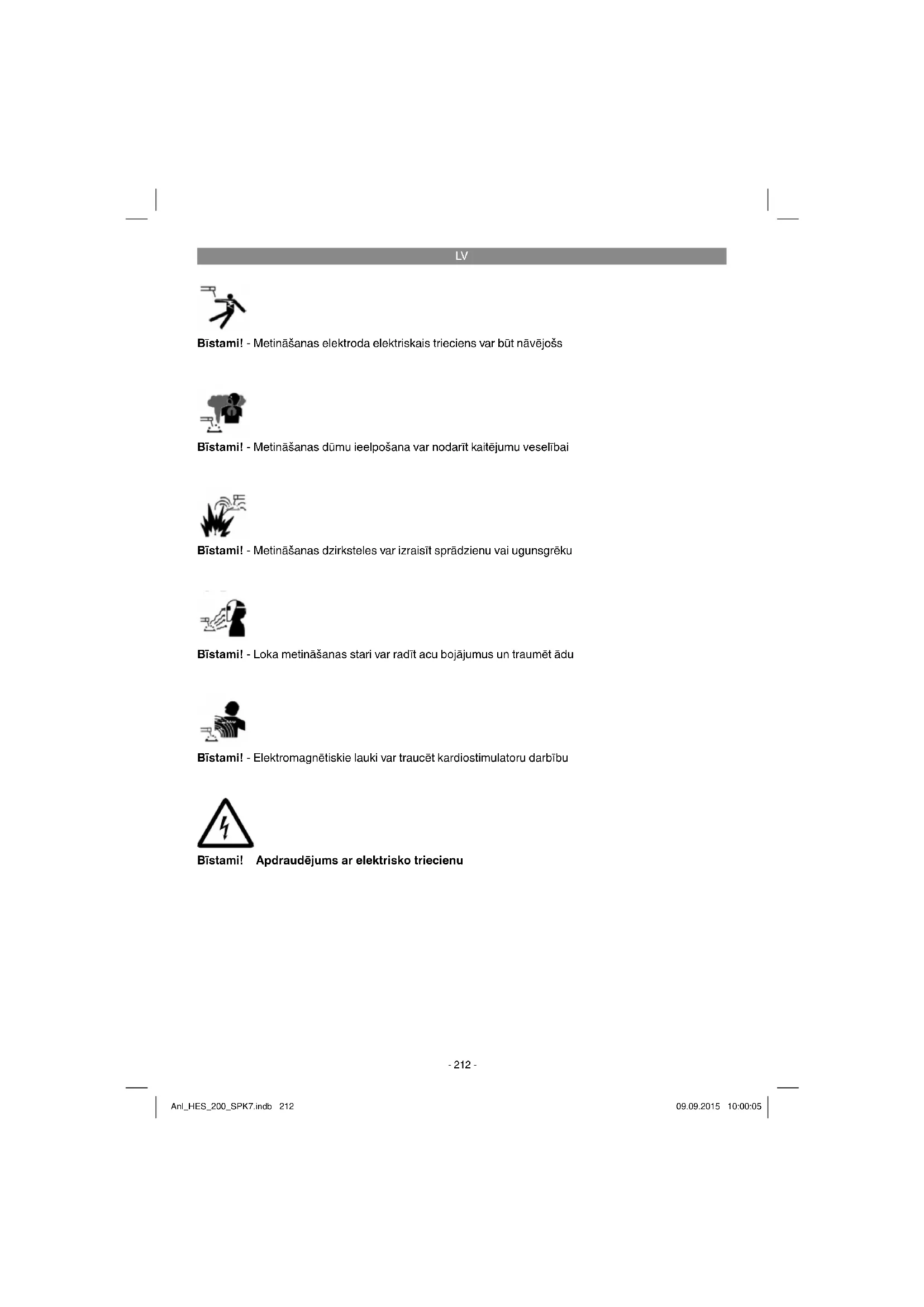 Bīstami! - Metināšanas elektroda elektriskais trieciens var būt nāvējošs Bīstami! - Metināšanas dūmu ieelpošana var nodarīt kaitējumu veselībai Bīstami! - Loka metināšanas stari var radīt acu bojājumus un traumēt ādu Bīstami! - Metināšanas dzirksteles var izraisīt sprādzienu vai ugunsgrēku Bīstami! - Elektromagnētiskie lauki var traucēt kardiostimulatoru darbību Bīstami! Apdraudējums ar elektrisko triecienu Anl_HES_200_SPK7.indb 212Anl_HES_200_SPK7.indb 212 09.09.2015 10:00:0509.09.2015 10:00:05LV