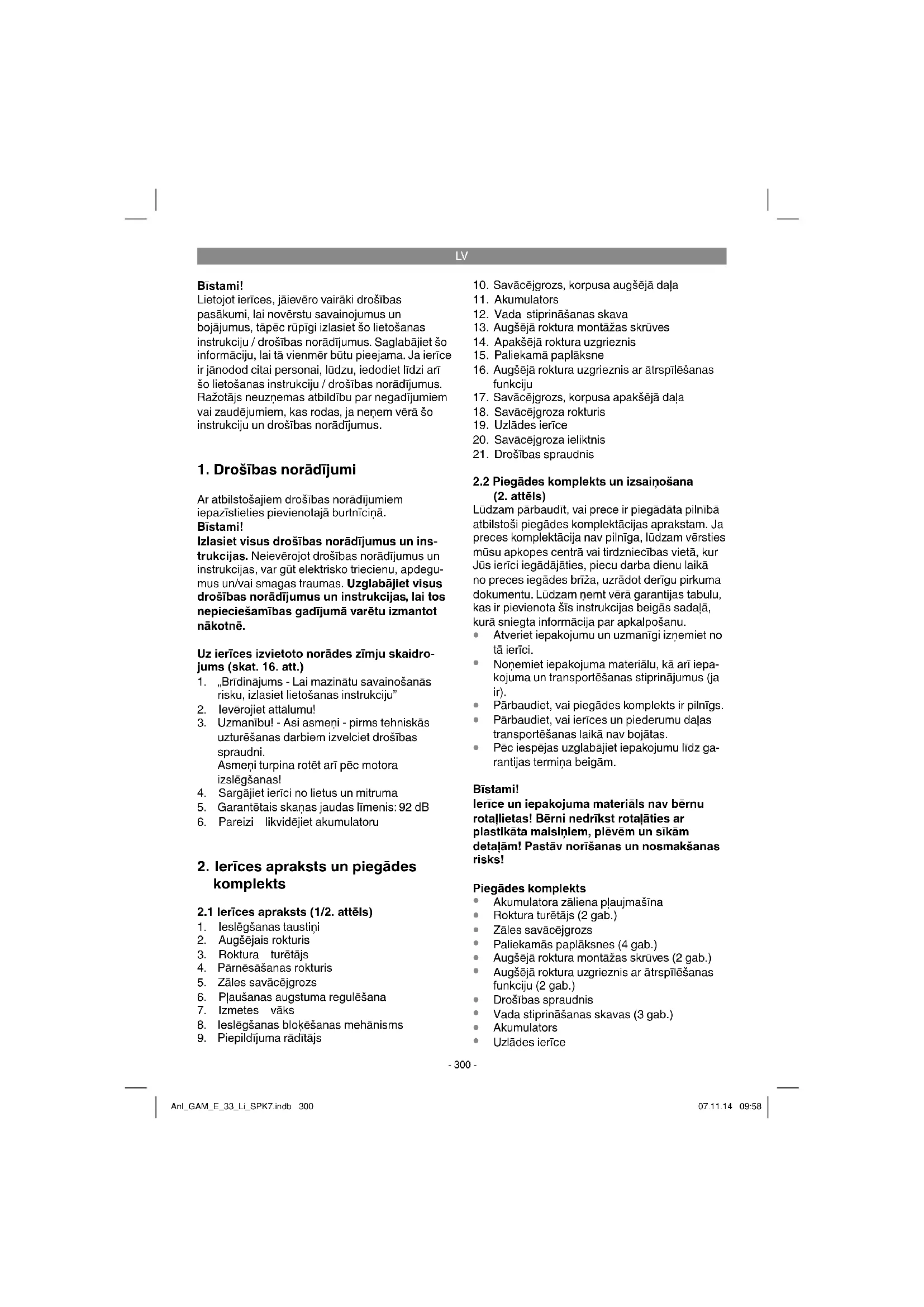 izmantošana Ierīce atrodas iepakojumā, lai izvairītos no bojājumiem transportēšanas laikā. Iepakojums ir izejmateriāls un to var izmantot atkārtoti vai nodot izejvielu apritē. Ierīce un tās piederumi ir no dažādiem materiāliem, piemēram, metāla un plastmasas. Bojātas detaļas nav sadzīves atkri- tumi. Lai nodrošinātu tehniski pareizu utilizāciju, ierīce jānodod attiecīgā savākšanas vietā. Ja Jums nav zināma šāda savākšanas vieta, jautājiet pašvaldībā. Anl_GAM_E_33_Li_SPK7.indb 305Anl_GAM_E_33_Li_SPK7.indb 305 07.11.14 09:5807.11.14 09:58LV