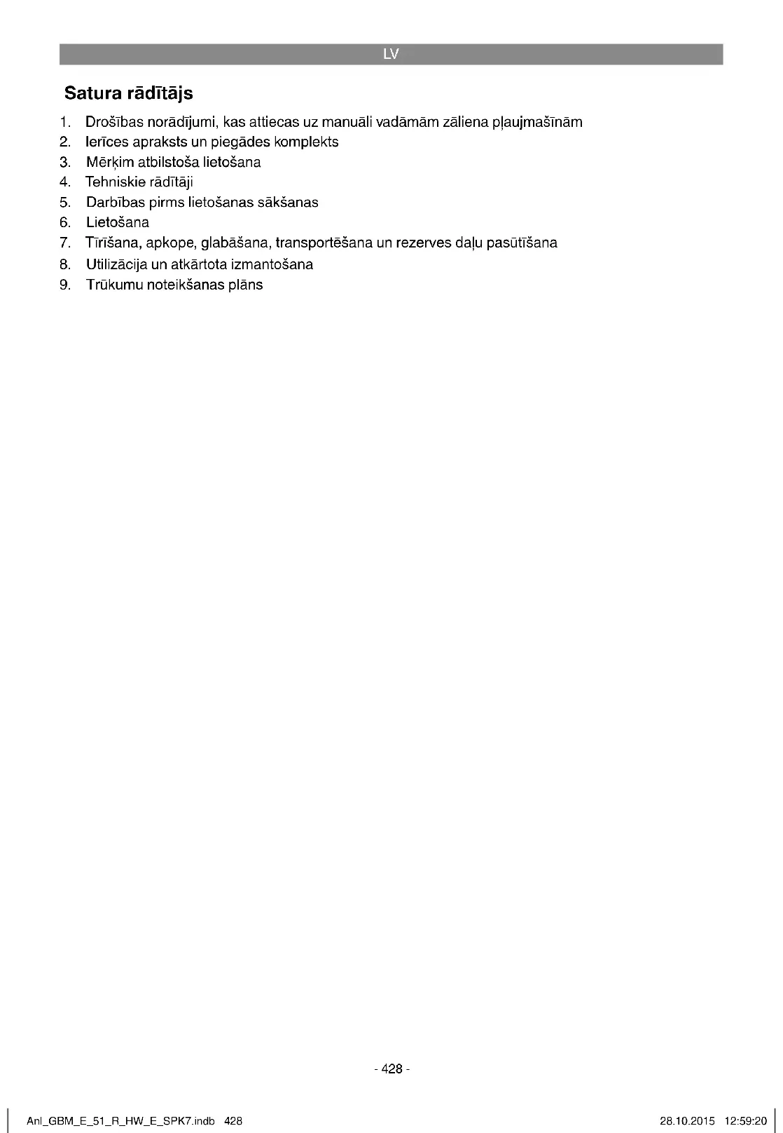 izmantošana Ierīce atrodas iepakojumā, lai izvairītos no bojājumiem transportēšanas laikā. Iepakojums ir izejmateriāls, un to var izmantot atkārtoti vai nodot izejvielu apritē. Ierīce un tās piederumi ir no dažādiem materiāliem, piemēram, metāla un plastmasas. Bojātās detaļas jānodod īpašo atkri- tumu pārstrādei. Jautājiet specializētā veikalā vai pašvaldībā! Anl_GBM_E_51_R_HW_E_SPK7.indb 441Anl_GBM_E_51_R_HW_E_SPK7.indb 441 28.10.2015 12:59:2128.10.2015 12:59:21LV