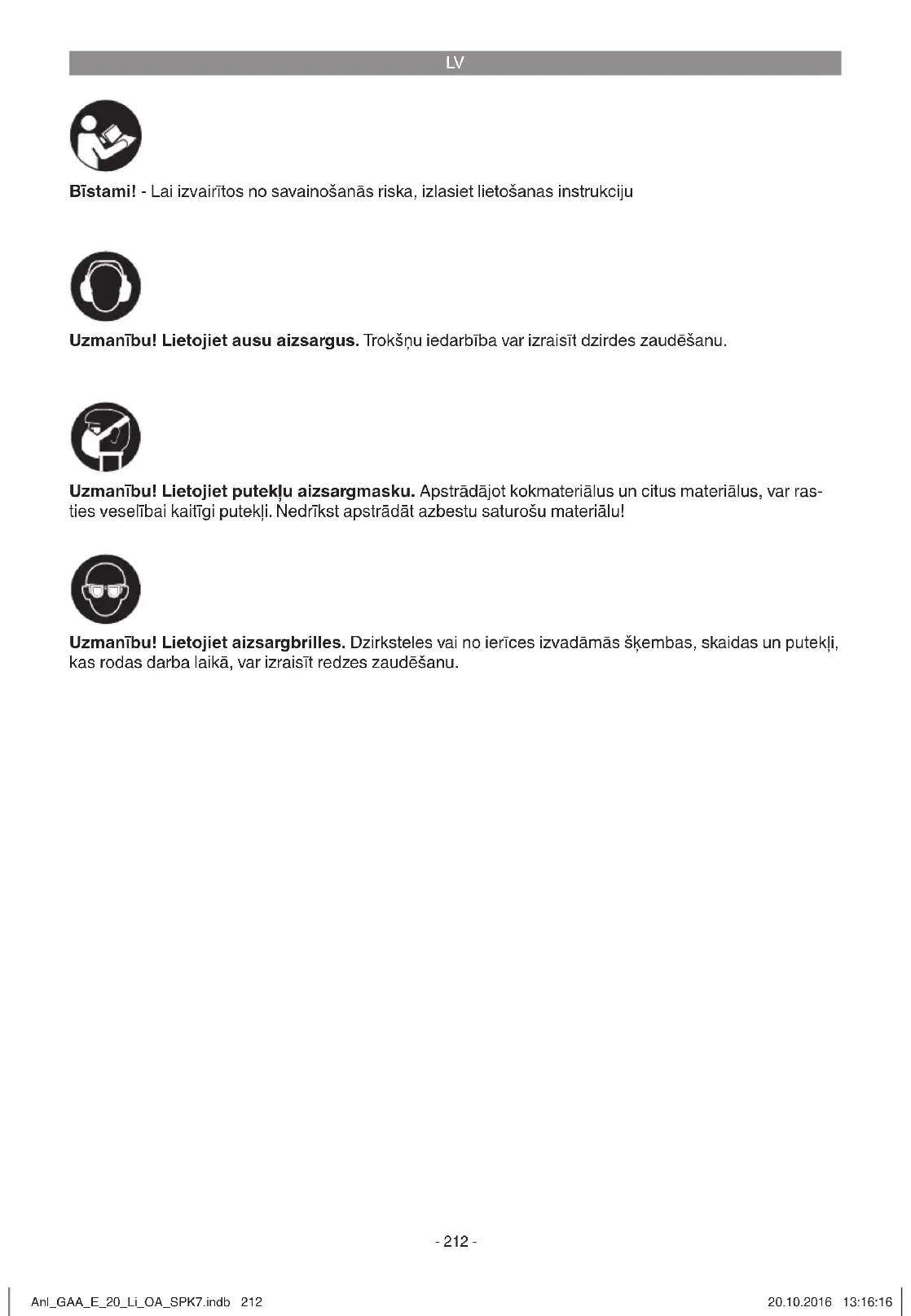 Bīstami! - Lai izvairītos no savainošanās riska, izlasiet lietošanas instrukciju Uzmanību! Lietojiet ausu aizsargus. Trokšņu iedarbība var izraisīt dzirdes zaudēšanu. Uzmanību! Lietojiet aizsargbrilles. Dzirksteles vai no ierīces izvadāmās šķembas, skaidas un putekļi, kas rodas darba laikā, var izraisīt redzes zaudēšanu. Uzmanību! Lietojiet putekļu aizsargmasku. Apstrādājot kokmateriālus un citus materiālus, var ras- ties veselībai kaitīgi putekļi. Nedrīkst apstrādāt azbestu saturošu materiālu! Anl_GAA_E_20_Li_OA_SPK7.indb 212Anl_GAA_E_20_Li_OA_SPK7.indb 212 20.10.2016 13:16:1620.10.2016 13:16:16LV
