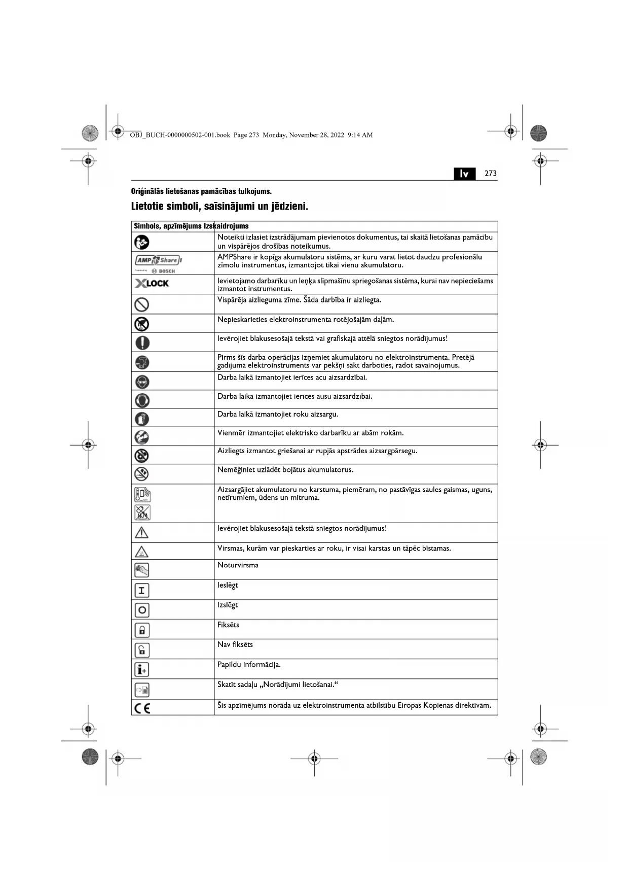 Oriģinālās lietošanas pamācības tulkojums. Lietotie simboli, saīsinājumi un jēdzieni. Simbols, apzīmējums Izskaidrojums Noteikti izlasiet izstrādājumam pievienotos dokumentus, tai skaitā lietošanas pamācību un vispārējos drošības noteikumus. AMPShare ir kopīga akumulatoru sistēma, ar kuru varat lietot daudzu profesionālu zīmolu instrumentus, izmantojot tikai vienu akumulatoru. Ievietojamo darbarīku un leņķa slīpmašīnu spriegošanas sistēma, kurai nav nepieciešams izmantot instrumentus. Vispārēja aizlieguma zīme. Šāda darbība ir aizliegta. Nepieskarieties elektroinstrumenta rotējošajām daļām. Ievērojiet blakusesošajā tekstā vai grafiskajā attēlā sniegtos norādījumus! Pirms šīs darba operācijas izņemiet akumulatoru no elektroinstrumenta. Pretējā gadījumā elektroinstruments var pēkšņi sākt darboties, radot savainojumus. Darba laikā izmantojiet ierīces acu aizsardzībai. Darba laikā izmantojiet ierīces ausu aizsardzībai. Darba laikā izmantojiet roku aizsargu. Vienmēr izmantojiet elektrisko darbarīku ar abām rokām. Aizliegts izmantot griešanai ar rupjās apstrādes aizsargpārsegu. Nemēģiniet uzlādēt bojātus akumulatorus. Aizsargājiet akumulatoru no karstuma, piemēram, no pastāvīgas saules gaismas, uguns, netīrumiem, ūdens un mitruma. Ievērojiet blakusesošajā tekstā sniegtos norādījumus! Virsmas, kurām var pieskarties ar roku, ir visai karstas un tāpēc bīstamas. Noturvirsma Ieslēgt Izslēgt Fiksēts Nav fiksēts Papildu informācija. Skatīt sadaļu „Norādījumi lietošanai.“ Šis apzīmējums norāda uz elektroinstrumenta atbilstību Eiropas Kopienas direktīvām. max.50°C OBJ_BUCH-0000000502-001.book Page 273 Monday, November 28, 2022 9:14 AM274