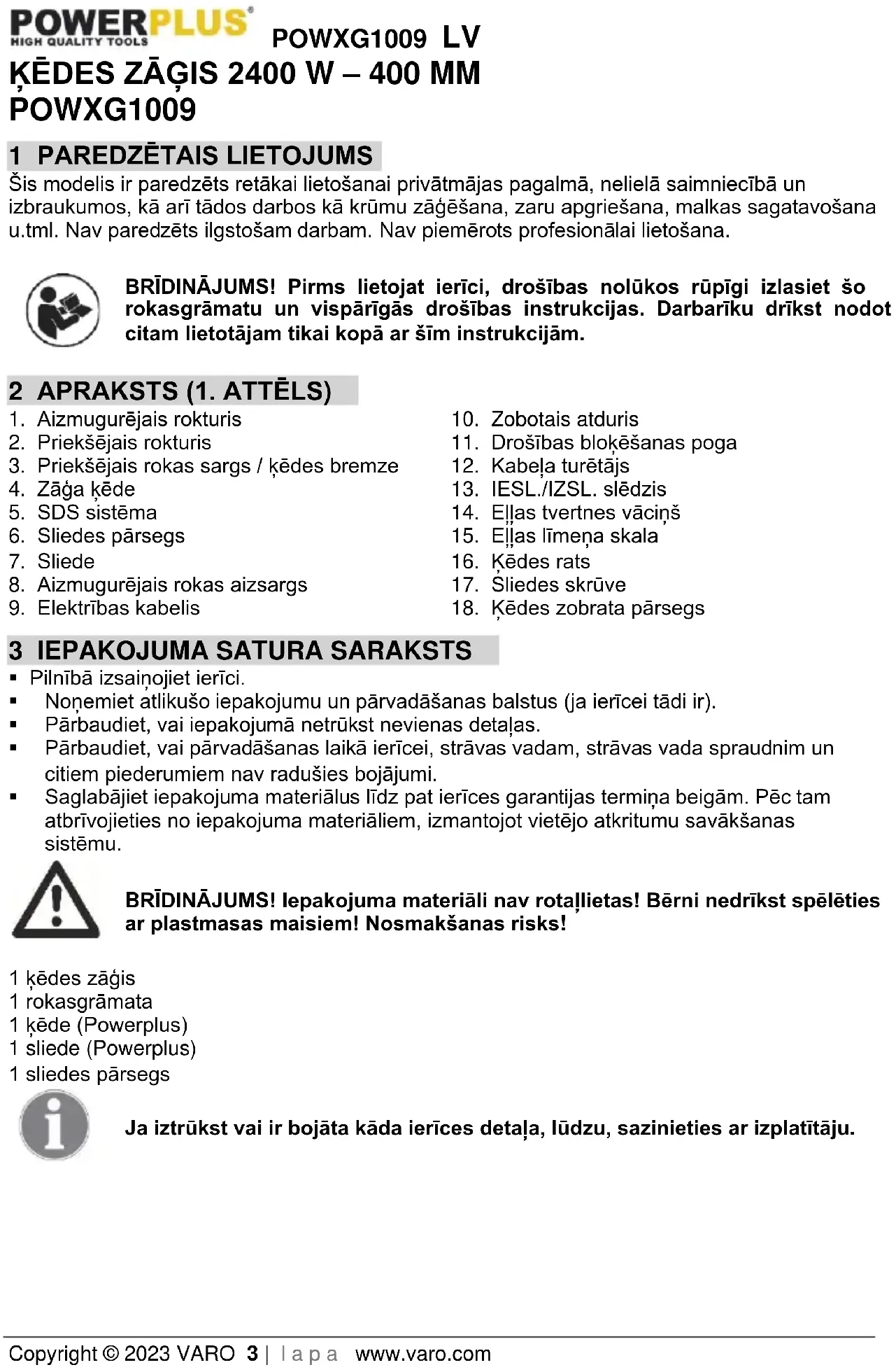 - Saglabājiet iepakojuma materiālus līdz pat ierīces garantijas termiņa beigām. Pēc tam atbrīvojieties no iepakojuma materiāliem, izmantojot vietējo atkritumu savākšanas sistēmu. BRĪDINĀJUMS! Iepakojuma materiāli nav rotaļlietas! Bērni nedrīkst spēlēties ar plastmasas maisiem! Nosmakšanas risks! 1 ķēdes zāģis 1 rokasgrāmata 1 ķēde (Powerplus) 1 sliede (Powerplus) 1 sliedes pārsegs Ja iztrūkst vai ir bojāta kāda ierīces detaļa, lūdzu, sazinieties ar izplatītāju.POWXG1009 LV Copyright © 2023 VARO 4 | l a p a www.varo.com