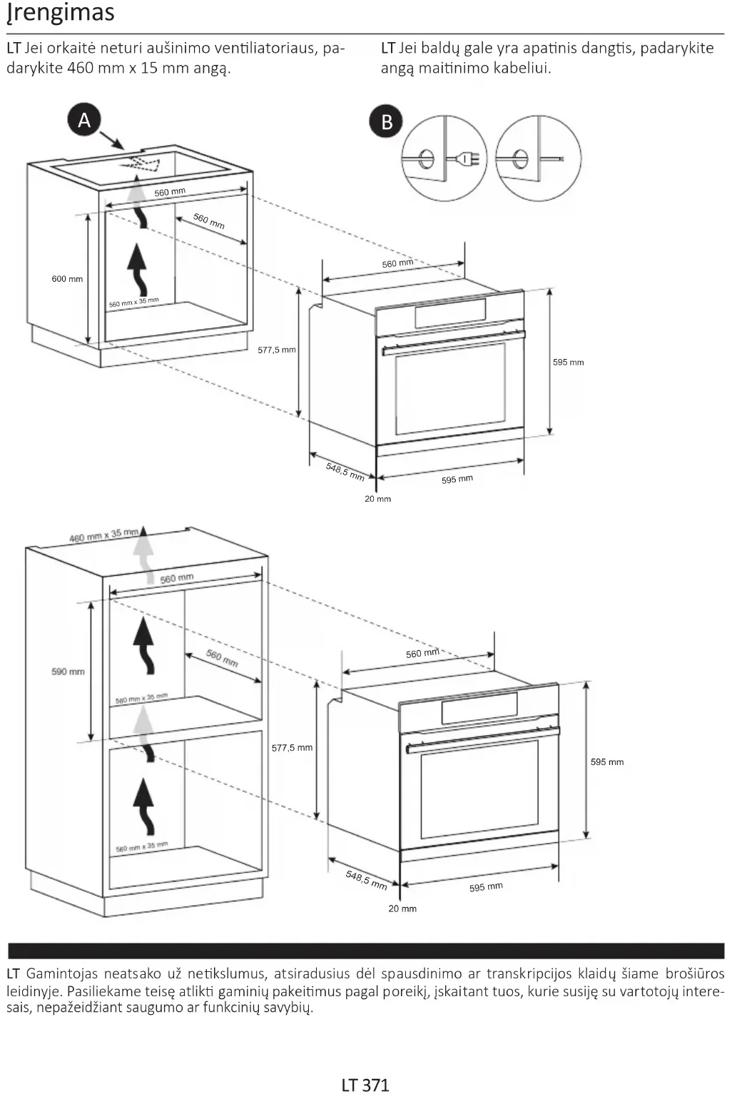 LT Jei baldų gale yra apanis dangs, padarykite angą mainimo kabeliui. LT Jei orkaitė neturi aušinimo venliatoriaus, pa- darykite 460 mm x 15 mm angą.LV 372 Norādījumi drošībai Vispārīgi norādījumi Produkta apraksts Vadības paneļa apraksts Gatavošanas režīmi Vispārīgas piezīmes par rīšanu Apkope Problēmu novēršana Uzstādīšana Kopsavilkums