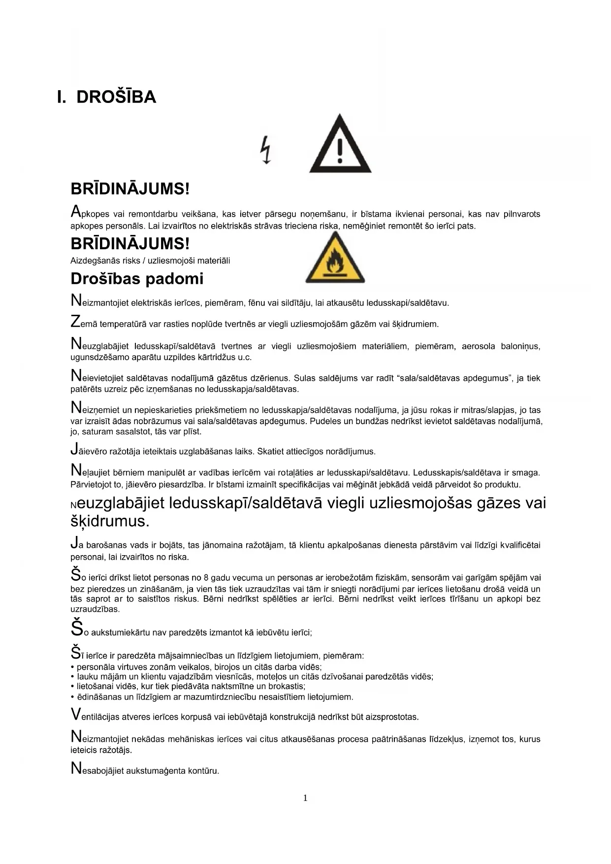 BRĪDINĀJUMS! Apkopes vai remontdarbu veikšana, kas ietver pārsegu noņemšanu, ir bīstama ikvienai personai, kas nav pilnvarots apkopes personāls. Lai izvairītos no elektriskās strāvas trieciena riska, nemēģiniet remontēt šo ierīci pats. BRĪDINĀJUMS! Aizdegšanās risks / uzliesmojoši materiāli Drošības padomi Neizmantojiet elektriskās ierīces, piemēram, fēnu vai sildītāju, lai atkausētu ledusskapi/saldētavu. Zemā temperatūrā var rasties noplūde tvertnēs ar viegli uzliesmojošām gāzēm vai šķidrumiem. Neuzglabājiet ledusskapī/saldētavā tvertnes ar viegli uzliesmojošiem materiāliem, piemēram, aerosola baloniņus, ugunsdzēšamo aparātu uzpildes kārtridžus u.c. Neievietojiet saldētavas nodalījumā gāzētus dzērienus. Sulas saldējums var radīt “sala/saldētavas apdegumus”, ja tiek patērēts uzreiz pēc izņemšanas no ledusskapja/saldētavas. Neizņemiet un nepieskarieties priekšmetiem no ledusskapja/saldētavas nodalījuma, ja jūsu rokas ir mitras/slapjas, jo tas var izraisīt ādas nobrāzumus vai sala/saldētavas apdegumus. Pudeles un bundžas nedrīkst ievietot saldētavas nodalījumā, jo, saturam sasalstot, tās var plīst. Jāievēro ražotāja ieteiktais uzglabāšanas laiks. Skatiet attiecīgos norādījumus. Neļaujiet bērniem manipulēt ar vadības ierīcēm vai rotaļāties ar ledusskapi/saldētavu. Ledusskapis/saldētava ir smaga. Pārvietojot to, jāievēro piesardzība. Ir bīstami izmainīt specifikācijas vai mēģināt jebkādā veidā pārveidot šo produktu. Neuzglabājiet ledusskapī/saldētavā viegli uzliesmojošas gāzes vai šķidrumus. Ja barošanas vads ir bojāts, tas jānomaina ražotājam, tā klientu apkalpošanas dienesta pārstāvim vai līdzīgi kvalificētai personai, lai izvairītos no riska. Šo ierīci drīkst lietot personas no 8 gadu vecuma un personas ar ierobežotām fiziskām, sensorām vai garīgām spējām vai bez pieredzes un zināšanām, ja vien tās tiek uzraudzītas vai tām ir sniegti norādījumi par ierīces lietošanu drošā veidā un tās saprot ar to saistītos riskus. Bērni nedrīkst spēlēties ar ierīci. Bērni nedrīkst veikt ierīces tīrīšanu un apkopi bez uzraudzības. Šo aukstumiekārtu nav paredzēts izmantot kā iebūvētu ierīci; Šī ierīce ir paredzēta mājsaimniecības un līdzīgiem lietojumiem, piemēram: personāla virtuves zonām veikalos, birojos un citās darba vidēs; lauku mājām un klientu vajadzībām viesnīcās, moteļos un citās dzīvošanai paredzētās vidēs; lietošanai vidēs, kur tiek piedāvāta naktsmītne un brokastis; ēdināšanas un līdzīgiem ar mazumtirdzniecību nesaistītiem lietojumiem. Ventilācijas atveres ierīces korpusā vai iebūvētajā konstrukcijā nedrīkst būt aizsprostotas. Neizmantojiet nekādas mehāniskas ierīces vai citus atkausēšanas procesa paātrināšanas līdzekļus, izņemot tos, kurus ieteicis ražotājs. Nesabojājiet aukstumaģenta kontūru.2 Pārtikas uzglabāšanas nodalījumos neizmantojiet nekādas elektroierīces, izņemot tās, kuras ieteicis ražotājs. Neglabājiet šajā ierīcē sprādzienbīstamas vielas, piemēram, aerosola baloniņus ar uzliesmojošu propelentu. Šī ierīci nav paredzēta lietošanai personām (tostarp bērniem) ar ierobežotām fiziskām, sensorām vai garīgām spējām vai bez pieredzes un zināšanām, izņemot tad, ja tās tiek uzraudzītas vai persona, kas atbild par viņu drošību, ir tām sniegusi norādījumus par ierīces lietošanu. Bērni ir jāuzrauga, lai nodrošinātu, ka viņi nespēlējas ar ierīci. - BRĪDINĀJUMS! Ventilācijas atveres ierīces korpusā vai iebūvētajā konstrukcijā nedrīkst būt aizsprostotas. - BRĪDINĀJUMS! Neizmantojiet nekādas mehāniskas ierīces vai citus atkausēšanas procesa paātrināšanas līdzekļus, izņemot tos, kurus ieteicis ražotājs. - BRĪDINĀJUMS! Nesabojājiet aukstumaģenta kontūru. - BRĪDINĀJUMS! Ierīces pārtikas uzglabāšanas nodalījumos neizmantojiet nekādas elektroierīces, izņemot tās, kuras ieteicis ražotājs. - BRĪDINĀJUMS! Aukstumiekārtas, it īpaši I tipa ledusskapis–saldētava, var nedarboties nepārtraukti (iespējama satura atkušana vai pārmērīga temperatūras paaugstināšanās saldētās pārtikas nodalījumā), ja tās ilgstoši atrodas apstākļos, kuros temperatūra ir zemāka par diapazonu, kādam šī aukstumiekārta ir paredzēta. - BRĪDINĀJUMS! Ir svarīgi, lai durvju vai vāku, kas aprīkoti ar slēdzenēm un atslēgām, atslēgas glabātos bērniem nepieejamā vietā, nevis aukstumiekārtas tuvumā, lai novērstu bērnu ieslēgšanu ierīcē. - BRĪDINĀJUMS! Uz ierīcē izmantoto aukstumaģentu un izolācijas materiāliem attiecas atsevišķi utilizācijas noteikumi. - BRĪDINĀJUMS! Novietojot ierīci, pārliecinieties, vai barošanas vads nav iesprostots vai bojāts. - BRĪDINĀJUMS! Ierīces aizmugurē nenovietojiet vairākas pārnēsājamās kontaktligzdas vai pārnēsājamos barošanas blokus. Bērniem vecumā no 3 līdz 8 gadiem ir atļauts ievietot un izņemt produktus no dzesēšanas ierīcēm. Lai izvairītos no pārtikas piesārņojuma, ievērojiet tālāk minētos norādījumus. - Ilgstoši atstājot vaļā durvis, var būtiski paaugstināties temperatūra ierīces nodalījumos. - Regulāri tīriet virsmas, kas var nonākt saskarē ar pārtiku, un pieejamās drenāžas sistēmas. - Iztīriet ūdens tvertnes, ja tās nav lietotas 48 stundas; izskalojiet ūdensapgādes sistēmai pievienoto ūdensvadu, ja ūdens padeve nav notikusi 5 dienas. - Jēlu gaļu un zivis uzglabājiet piemērotos traukos ledusskapī tā, lai tās nepieskartos citiem pārtikas produktiem un nepilētu uz tiem. - Ar divām zvaigznītēm apzīmētie saldētas pārtikas nodalījumi ir piemēroti iepriekš sasaldētas pārtikas uzglabāšanai, saldējuma uzglabāšanai vai pagatavošanai un ledus kubiņu sagatavošanai. - Ar vienu, divām un trīs zvaigznītēm apzīmē