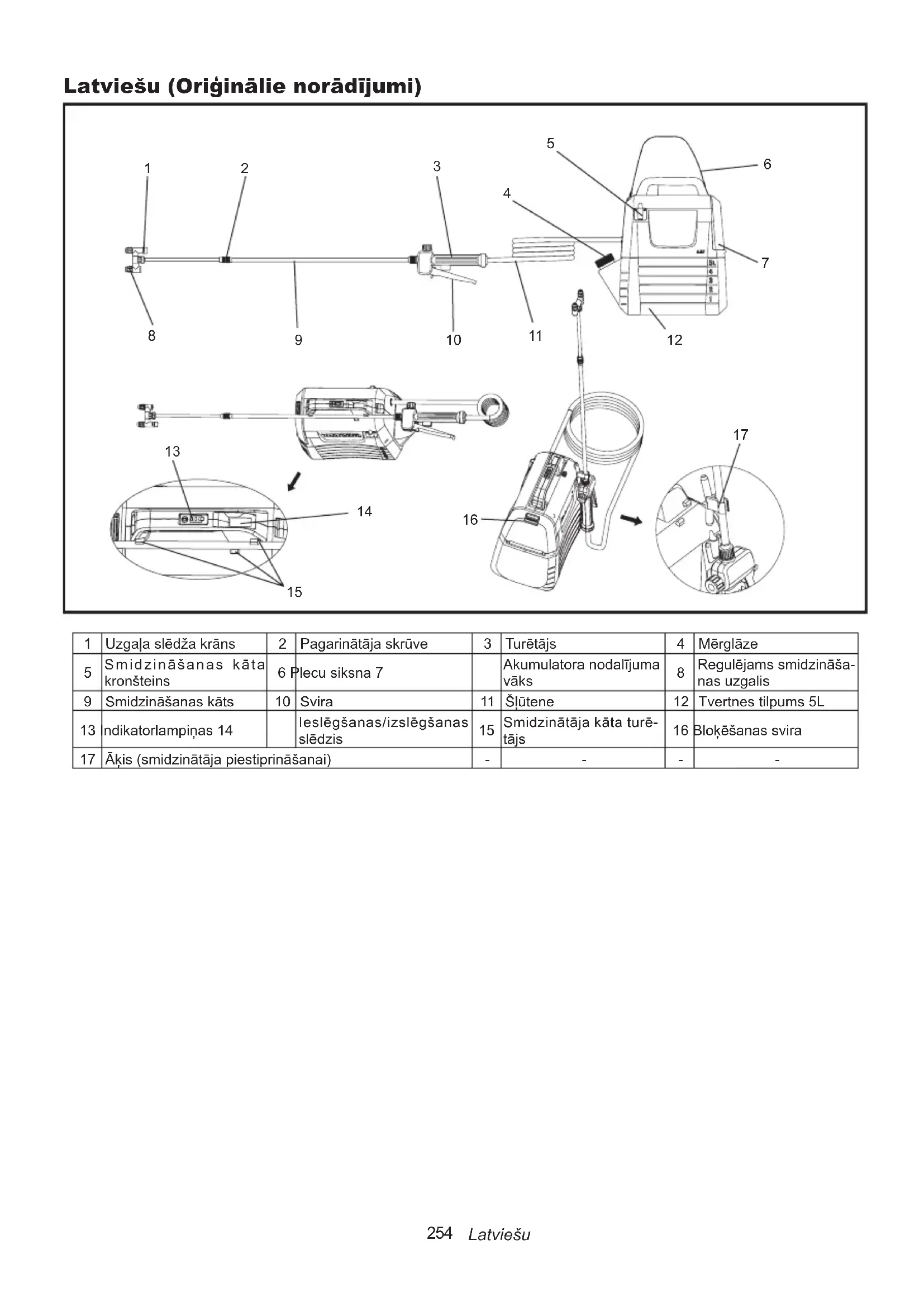 Regulējams smidzināša- nas uzgalis 9 Smidzināšanas kāts 10 Svira 11 Šļūtene 12 Tvertnes tilpums 5L 13 Indikatorlampiņas 14 Ieslēgšanas/izslēgšanas slēdzis