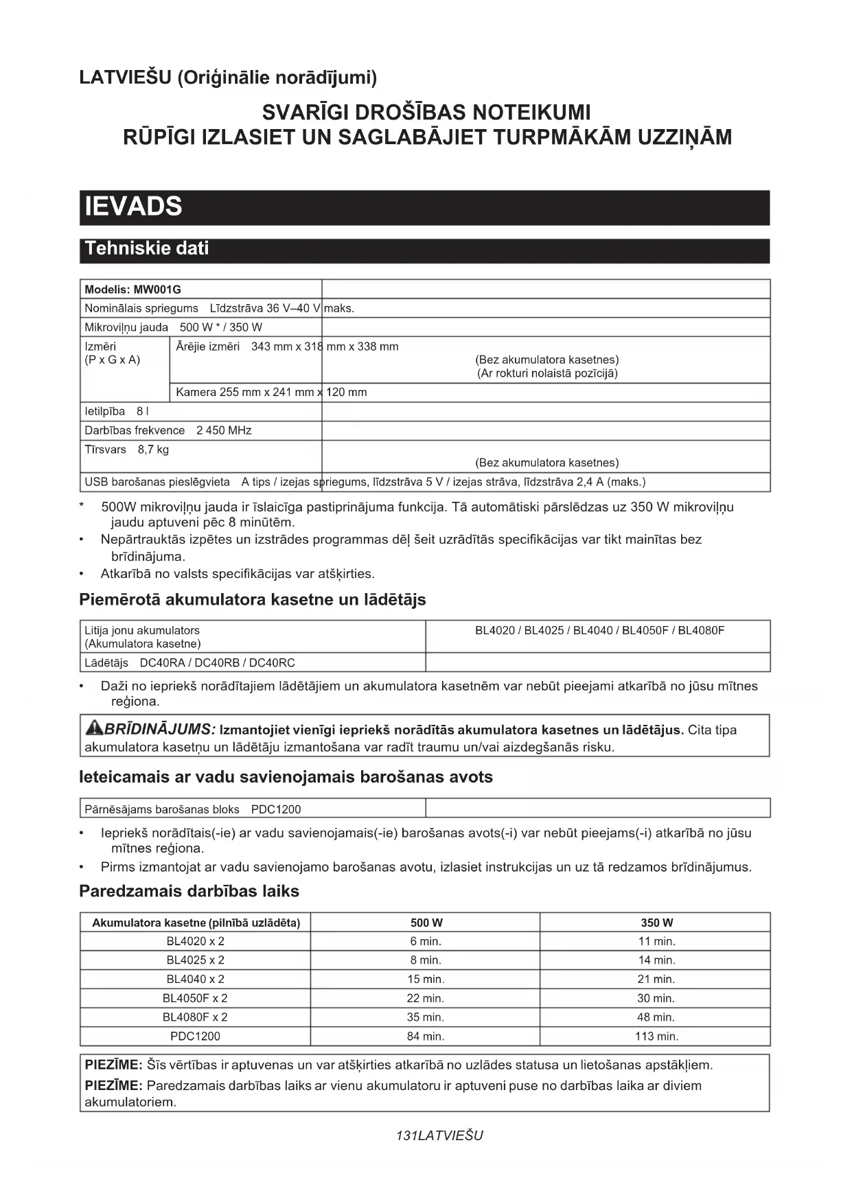 RŪPĪGI IZLASIET UN SAGLABĀJIET TURPMĀKĀM UZZIŅĀM IEVADS Tehniskie dati Modelis: MW001GNominālaisspriegums Līdzstrāva36V–40Vmaks.Mikroviļņujauda 500 W * / 350 WIzmēri(P x G x A)Ārējieizmēri 343 mm x 318 mm x 338 mm(Bez akumulatora kasetnes)(Arrokturinolaistāpozīcijā)Kamera 255 mm x 241 mm x 120 mmIetilpība 8 lDarbībasfrekvence 2 450 MHzTīrsvars 8,7 kg(Bez akumulatora kasetnes)USBbarošanaspieslēgvieta Atips/izejasspriegums,līdzstrāva5V/izejasstrāva,līdzstrāva2,4A(maks.)* 500Wmikroviļņujaudairīslaicīgapastiprinājumafunkcija.Tāautomātiskipārslēdzasuz350Wmikroviļņujauduaptuvenipēc8minūtēm.• Nepārtrauktāsizpētesunizstrādesprogrammasdēļšeituzrādītāsspecikācijasvartiktmainītasbezbrīdinājuma.• Atkarībānovalstsspecikācijasvaratšķirties. Piemērotā akumulatora kasetne un lādētājs Litijajonuakumulators(Akumulatora kasetne)BL4020 / BL4025 / BL4040 / BL4050F / BL4080FLādētājs DC40RA / DC40RB / DC40RC• Dažinoiepriekšnorādītajiemlādētājiemunakumulatorakasetnēmvarnebūtpieejamiatkarībānojūsumītnesreģiona. BRĪDINĀJUMS: Izmantojiet vienīgi iepriekš norādītās akumulatora kasetnes un lādētājus. Cita tipa akumulatorakasetņuunlādētājuizmantošanavarradīttraumuun/vaiaizdegšanāsrisku. Ieteicamais ar vadu savienojamais barošanas avots Pārnēsājamsbarošanasbloks PDC1200• Iepriekšnorādītais(-ie)arvadusavienojamais(-ie)barošanasavots(-i)varnebūtpieejams(-i)atkarībānojūsumītnesreģiona.• Pirmsizmantojatarvadusavienojamobarošanasavotu,izlasietinstrukcijasunuztāredzamosbrīdinājumus. Paredzamais darbības laiks Akumulatora kasetne (pilnībā uzlādēta) 500 W 350 W BL4020 x 2 6 min. 11 min.BL4025 x 2 8 min. 14 min.BL4040 x 2 15 min. 21 min.BL4050F x 2 22 min. 30 min.BL4080F x 2 35 min. 48 min.PDC1200 84 min. 113 min. PIEZĪME:Šīsvērtībasiraptuvenasunvaratšķirtiesatkarībānouzlādesstatusaunlietošanasapstākļiem. PIEZĪME:Paredzamaisdarbībaslaiksarvienuakumulatoruiraptuvenipusenodarbībaslaikaardiviem akumulatoriem.132 LATVIEŠU Paredzētā lietošana Šīierīceirparedzētapārtikaskarsēšanai. Svarīgi drošības pasākumi BRĪDINĀJUMS Šīs ierīces apkopi drīkst veikt tikai kvalicēts servisa personāls. Lai veiktu pārbaudes, remontu vai regulēšanu, sazinieties ar tuvāko piln- varoto servisa darbnīcu. BRĪDINĀJUMS Nedarbiniet šo ierīci ar atvērtām durvīm, jo tādējādi var rasties kaitīga mikroviļņu enerģijas iedarbība. BRĪDINĀJUMS Ja ir bojātas durvis (saliektas), eņģes (salauztas vai atskrūvējušās), durvju blīves vai blīvējošā virsma, mikroviļņu krāsni nedrīkst darbināt, kamēr to nav saremontējusi kvalicēta persona. BRĪDINĀJUMS Ikvienai neapmācītai personai ir bīstami veikt jebkādas apkopes vai remonta darbī- bas, kas saistītas ar tādu pārsegu noņemšanu, kuri nodrošina aizsardzību pret mikroviļņu enerģijas iedarbību. BRĪDINĀJUMS Izmantojiet šo ierīci tikai tās pare- dzētajam lietojumam, kas aprakstīts rokasgrāmatā. BRĪDINĀJUMS Neizmantojiet šajā ierīcē korozīvas ķīmiskas vielas vai tvaikus. BRĪDINĀJUMS Šī ierīce ir konkrēti konstruēta ēdiena karsēšanai, gatavošanai vai kaltēšanai. Tā nav paredzēta industriālai vai laboratoriskai izmantošanai. BRĪDINĀJUMS Šķidrumus un citu pārtiku nedrīkst karsēt slēgtos traukos, jo tie var uzsprāgt.