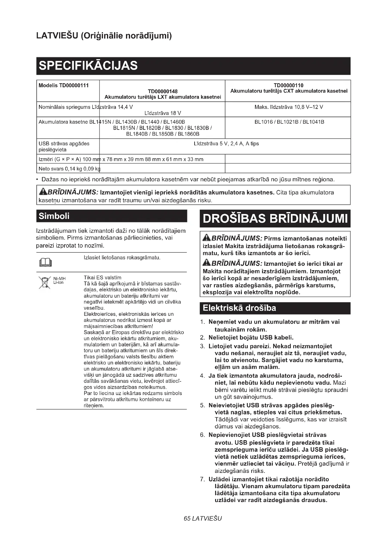 BRĪDINĀJUMS: Pirms izmantošanas noteikti izlasiet Makita izstrādājuma lietošanas rokasgrā- matu, kurš tiks izmantots ar šo ierīci. BRĪDINĀJUMS: Izmantojiet šo ierīci tikai ar Makita norādītajiem izstrādājumiem. Izmantojot šo ierīci kopā ar nesaderīgiem izstrādājumiem, var rasties aizdegšanās, pārmērīgs karstums, eksplozija vai elektrolīta noplūde. Elektriskā drošība