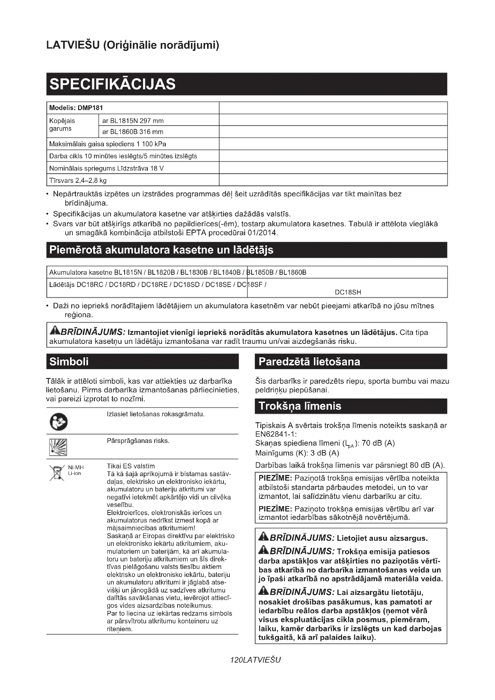 - Svars var būt atšķirīgs atkarībā no papildierīces(-ēm), tostarp akumulatora kasetnes. Tabulā ir attēlota vieglākā un smagākā kombinācija atbilstoši EPTA procedūrai 01/2014. Piemērotā akumulatora kasetne un lādētājs Akumulatora kasetne BL1815N / BL1820B / BL1830B / BL1840B / BL1850B / BL1860B Lādētājs DC18RC / DC18RD / DC18RE / DC18SD / DC18SE / DC18SF / DC18SH
