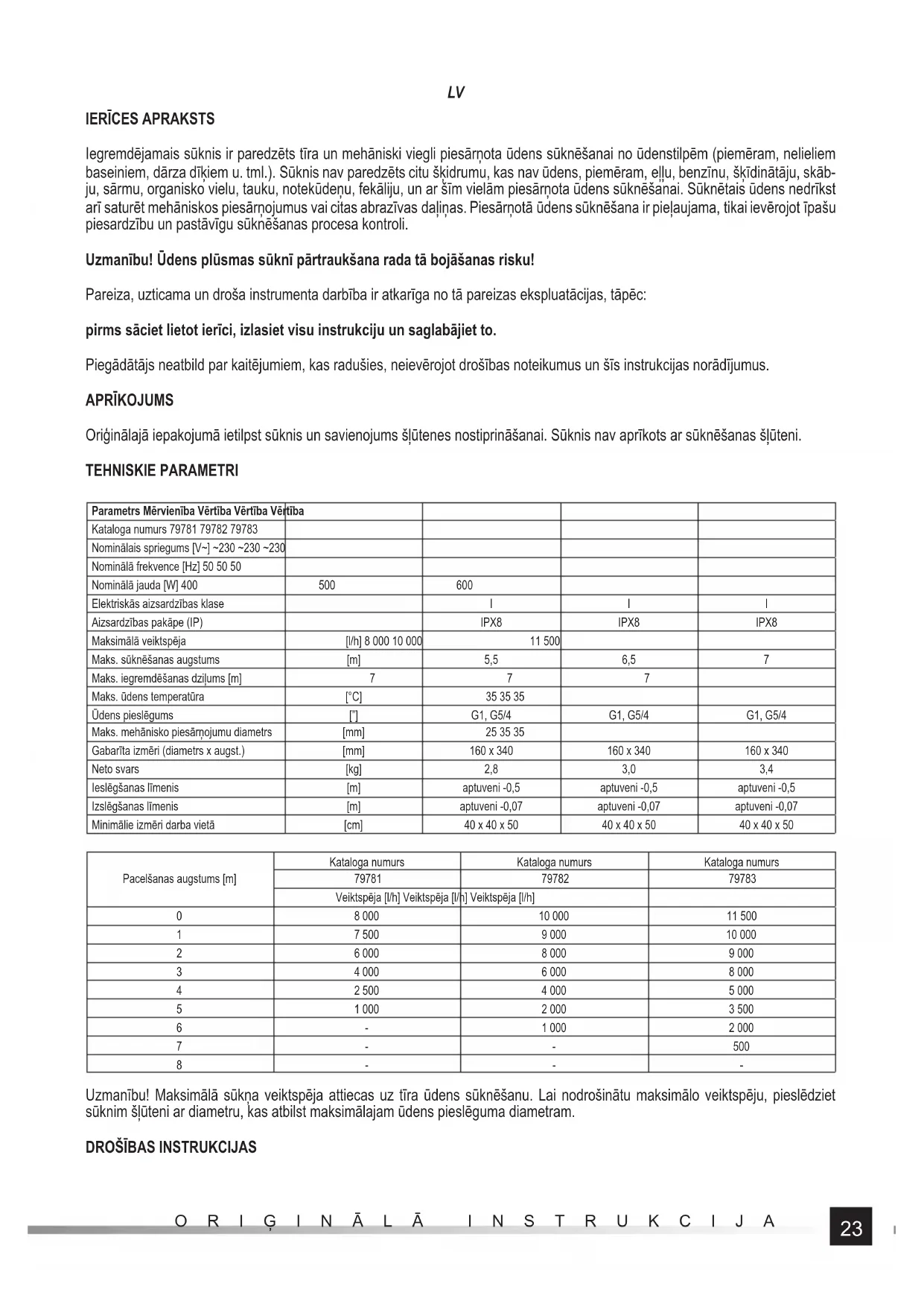 Iegremdējamais sūknis ir paredzēts tīra un mehāniski viegli piesārņota ūdens sūknēšanai no ūdenstilpēm (piemēram, nelieliem baseiniem, dārza dīķiem u. tml.). Sūknis nav paredzēts citu šķidrumu, kas nav ūdens, piemēram, eļļu, benzīnu, šķīdinātāju, skāb- ju, sārmu, organisko vielu, tauku, notekūdeņu, fekāliju, un ar šīm vielām piesārņota ūdens sūknēšanai. Sūknētais ūdens nedrīkst arī saturēt mehāniskos piesārņojumus vai citas abrazīvas daļiņas. Piesārņotā ūdens sūknēšana ir pieļaujama, tikai ievērojot īpašu piesardzību un pastāvīgu sūknēšanas procesa kontroli. Uzmanību! Ūdens plūsmas sūknī pārtraukšana rada tā bojāšanas risku! Pareiza, uzticama un droša instrumenta darbība ir atkarīga no tā pareizas ekspluatācijas, tāpēc: pirms sāciet lietot ierīci, izlasiet visu instrukciju un saglabājiet to. Piegādātājs neatbild par kaitējumiem, kas radušies, neievērojot drošības noteikumus un šīs instrukcijas norādījumus. APRĪKOJUMS Oriģinālajā iepakojumā ietilpst sūknis un savienojums šļūtenes nostiprināšanai. Sūknis nav aprīkots ar sūknēšanas šļūteni. TEHNISKIE PARAMETRI Parametrs Mērvienība Vērtība Vērtība Vērtība Kataloga numurs 79781 79782 79783 Nominālais spriegums [V~] ~230 ~230 ~230 Nominālā frekvence [Hz] 50 50 50 Nominālā jauda [W] 400 500 600 Elektriskās aizsardzības klase I I I Aizsardzības pakāpe (IP) IPX8 IPX8 IPX8 Maksimālā veiktspēja [l/h] 8 000 10 000 11 500 Maks. sūknēšanas augstums [m] 5,5 6,5 7 Maks. iegremdēšanas dziļums [m] 7 7 7 Maks. ūdens temperatūra [°C] 35 35 35 Ūdens pieslēgums [”] G1, G5/4 G1, G5/4 G1, G5/4 Maks. mehānisko piesārņojumu diametrs [mm] 25 35 35 Gabarīta izmēri (diametrs x augst.) [mm] 160 x 340 160 x 340 160 x 340 Neto svars [kg] 2,8 3,0 3,4 Ieslēgšanas līmenis [m] aptuveni -0,5 aptuveni -0,5 aptuveni -0,5 Izslēgšanas līmenis [m] aptuveni -0,07 aptuveni -0,07 aptuveni -0,07 Minimālie izmēri darba vietā [cm] 40 x 40 x 50 40 x 40 x 50 40 x 40 x 50 Pacelšanas augstums [m] Kataloga numurs Kataloga numurs Kataloga numurs