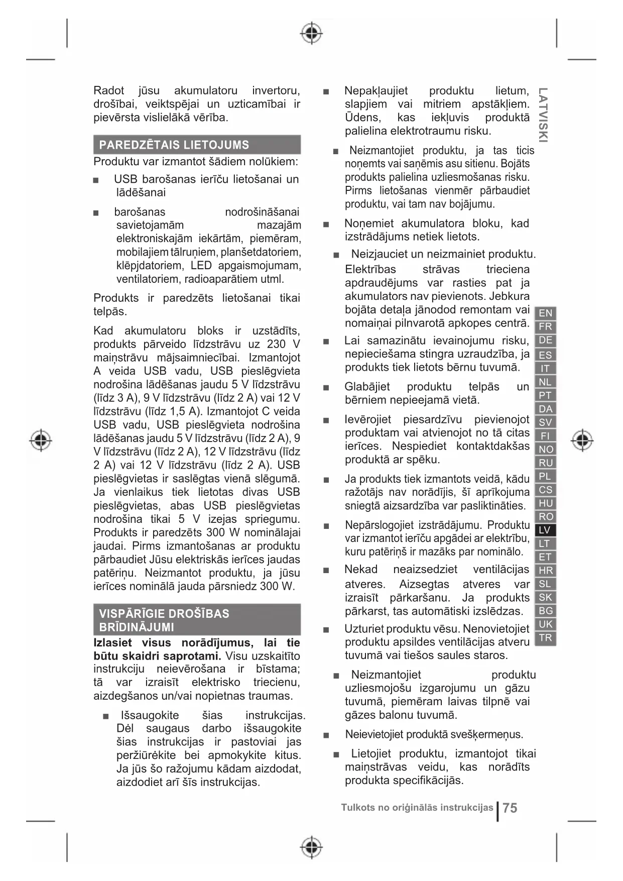 Izlasiet visus norādījumus, lai tie būtu skaidri saprotami. Visu uzskaitīto instrukciju neievērošana ir bīstama; tā var izraisīt elektrisko triecienu, aizdegšanos un/vai nopietnas traumas. ■ Išsaugokite šias instrukcijas. Dėl saugaus darbo išsaugokite šias instrukcijas ir pastoviai jas peržiūrėkite bei apmokykite kitus. Ja jūs šo ražojumu kādam aizdodat, aizdodiet arī šīs instrukcijas. ■ Nepakļaujiet produktu lietum, slapjiem vai mitriem apstākļiem. Ūdens, kas iekļuvis produktā palielina elektrotraumu risku. ■ Neizmantojiet produktu, ja tas ticis noņemts vai saņēmis asu sitienu. Bojāts produkts palielina uzliesmošanas risku. Pirms lietošanas vienmēr pārbaudiet produktu, vai tam nav bojājumu. ■ Noņemiet akumulatora bloku, kad izstrādājums netiek lietots. ■ Neizjauciet un neizmainiet produktu. Elektrības strāvas trieciena apdraudējums var rasties pat ja akumulators nav pievienots. Jebkura bojāta detaļa jānodod remontam vai nomaiņai pilnvarotā apkopes centrā. ■ Lai samazinātu ievainojumu risku, nepieciešama stingra uzraudzība, ja produkts tiek lietots bērnu tuvumā. ■ Glabājiet produktu telpās un bērniem nepieejamā vietā. ■ Ievērojiet piesardzīvu pievienojot produktam vai atvienojot no tā citas ierīces. Nespiediet kontaktdakšas produktā ar spēku. ■ Ja produkts tiek izmantots veidā, kādu ražotājs nav norādījis, šī aprīkojuma sniegtā aizsardzība var pasliktināties. ■ Nepārslogojiet izstrādājumu. Produktu var izmantot ierīču apgādei ar elektrību, kuru patēriņš ir mazāks par nominālo. ■ Nekad neaizsedziet ventilācijas atveres. Aizsegtas atveres var izraisīt pārkaršanu. Ja produkts pārkarst, tas automātiski izslēdzas. ■ Uzturiet produktu vēsu. Nenovietojiet produktu apsildes ventilācijas atveru tuvumā vai tiešos saules staros. ■ Neizmantojiet produktu uzliesmojošu izgarojumu un gāzu tuvumā, piemēram laivas tilpnē vai gāzes balonu tuvumā. ■ Neievietojiet produktā svešķermeņus. ■ Lietojiet produktu, izmantojot tikai maiņstrāvas veidu, kas norādīts produkta specifikācijās.