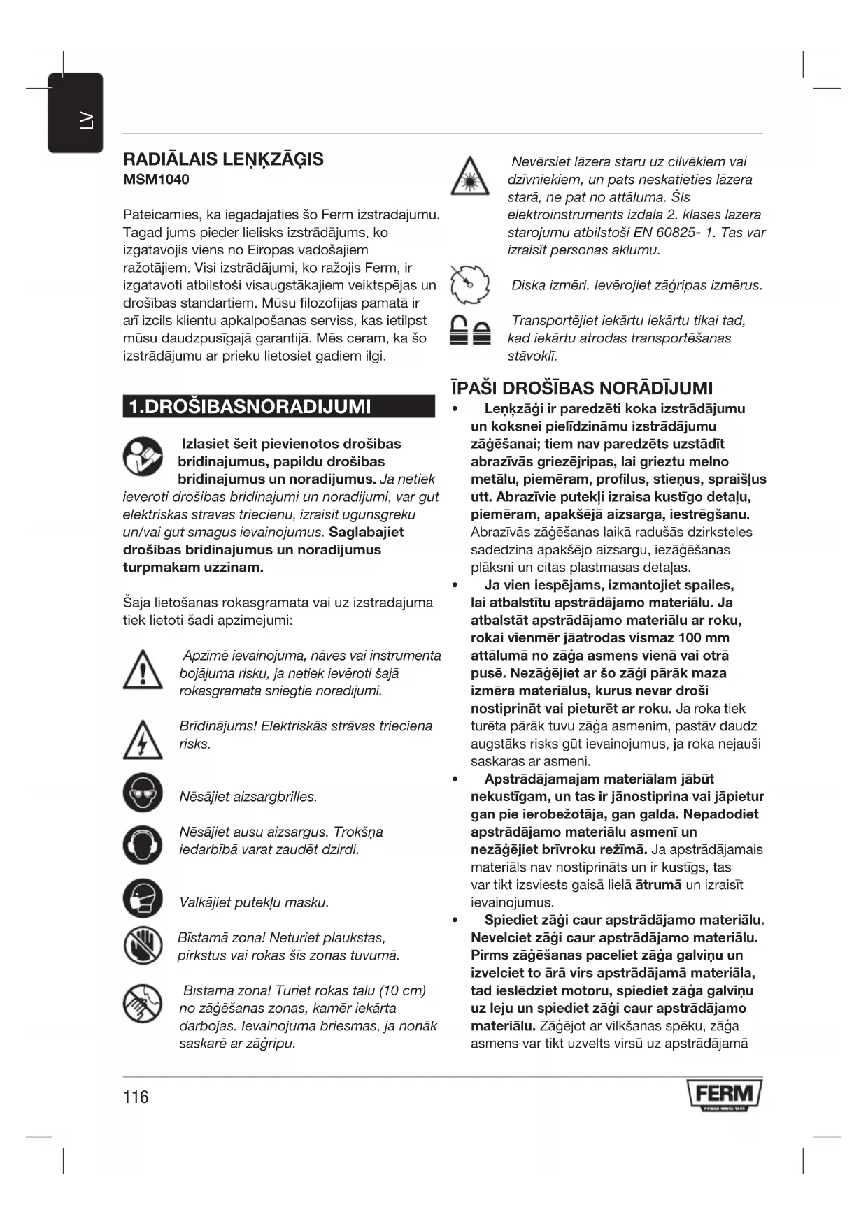 Izlasiet šeit pievienotos drošibas bridinajumus, papildu drošibas bridinajumus un noradijumus. Ja netiek ieveroti drošibas bridinajumi un noradijumi, var gut elektriskas stravas triecienu, izraisit ugunsgreku un/vai gut smagus ievainojumus. Saglabajiet drošibas bridinajumus un noradijumus turpmakam uzzinam. Šaja lietošanas rokasgramata vai uz izstradajuma tiek lietoti šadi apzimejumi: Apzīmē ievainojuma, nāves vai instrumenta bojājuma risku, ja netiek ievēroti šajā rokasgrāmatā sniegtie norādījumi. Brīdinājums! Elektriskās strāvas trieciena risks. Nēsājiet aizsargbrilles. Nēsājiet ausu aizsargus. Trokšņa iedarbībā varat zaudēt dzirdi. Valkājiet putekļu masku. Bīstamā zona! Neturiet plaukstas, pirkstus vai rokas šīs zonas tuvumā. Bīstamā zona! Turiet rokas tālu (10 cm) no zāģēšanas zonas, kamēr iekārta darbojas. Ievainojuma briesmas, ja nonāk saskarē ar zāģripu. Nevērsiet lāzera staru uz cilvēkiem vai dzīvniekiem, un pats neskatieties lāzera starā, ne pat no attāluma. Šis elektroinstruments izdala 2. klases lāzera starojumu atbilstoši EN 60825- 1. Tas var izraisīt personas aklumu. Diska izmēri. Ievērojiet zāģripas izmērus. Transportējiet iekārtu iekārtu tikai tad, kad iekārtu atrodas transportēšanas stāvoklī. ĪPAŠI DROŠĪBAS NORĀDĪJUMI