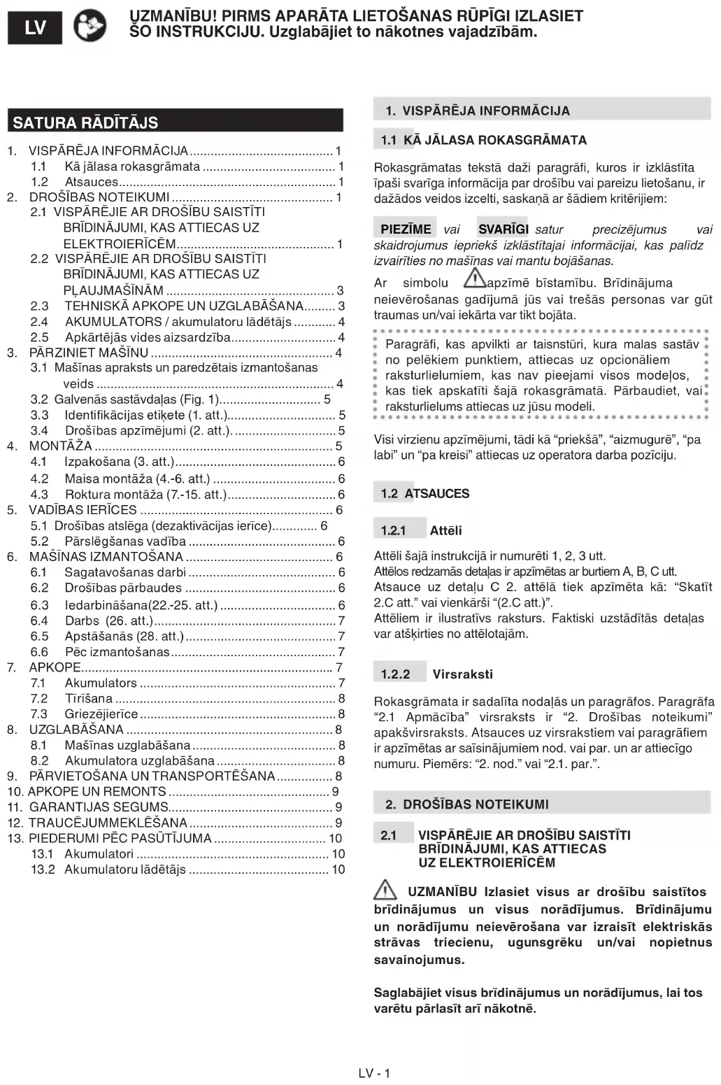 griezējierīce negriežas. Izļodzījies griezējierīces stiprinājums. Nekavējoties apturiet dzinēju un izņemiet drošības atslēgu. Sazinieties ar servisa centru, lai veiktu pārbaudi, nomaiņu vai remontu (par. 7.3).LV - 10 mašīnai apstiprināto akumulatoru saraksts ir atrodams tabulā "Tehniskie dati".