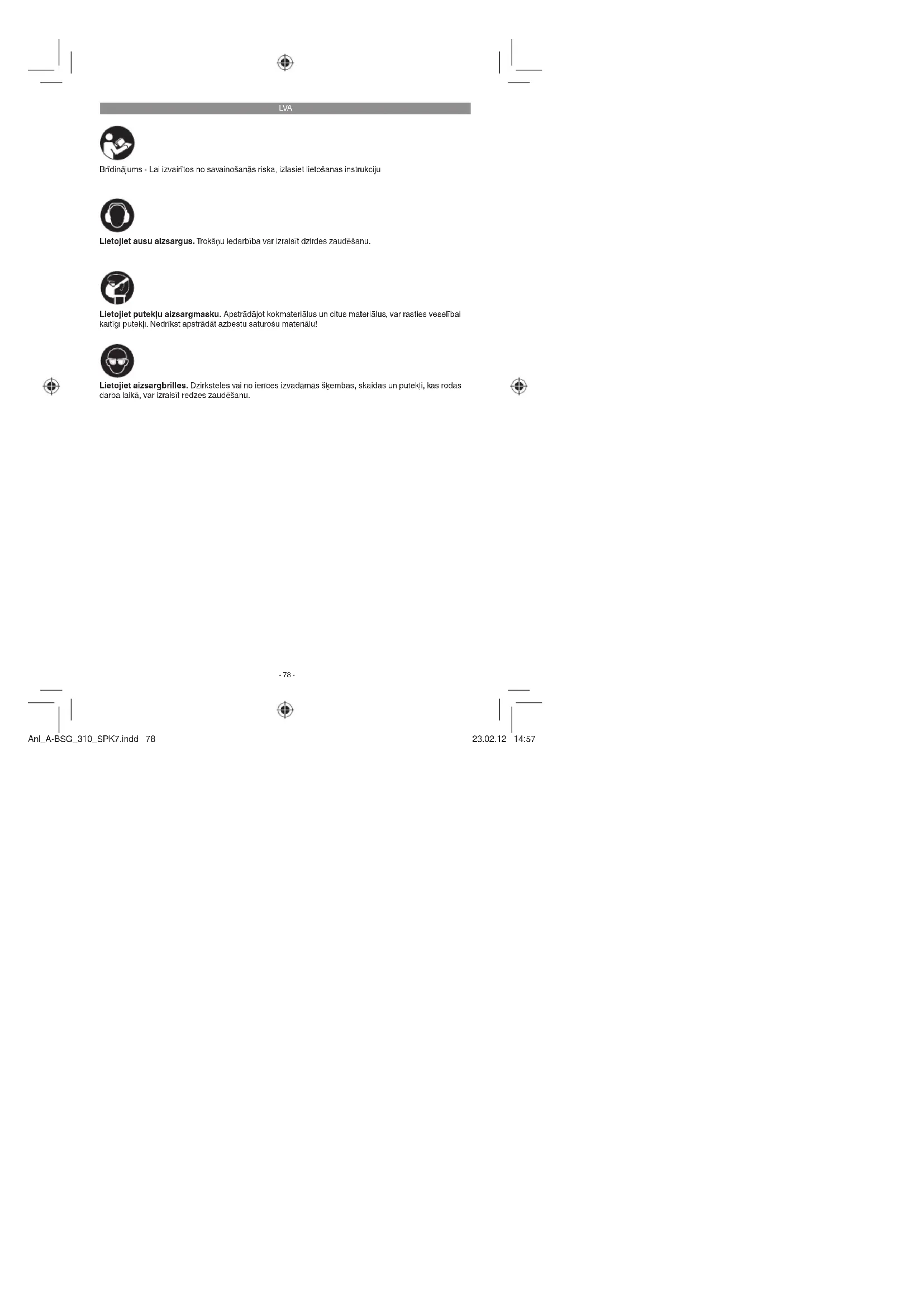 Brīdinājums - Lai izvairītos no savainošanās riska, izlasiet lietošanas instrukciju Lietojiet ausu aizsargus. Trokšņu iedarbība var izraisīt dzirdes zaudēšanu. Lietojiet aizsargbrilles. Dzirksteles vai no ierīces izvadāmās šķembas, skaidas un putekļi, kas rodas darba laikā, var izraisīt redzes zaudēšanu. Lietojiet putekļu aizsargmasku. Apstrādājot kokmateriālus un citus materiālus, var rasties veselībai kaitīgi putekļi. Nedrīkst apstrādāt azbestu saturošu materiālu! Anl_A-BSG_310_SPK7.indd 78Anl_A-BSG_310_SPK7.indd 78 23.02.12 14:5723.02.12 14:57LVA