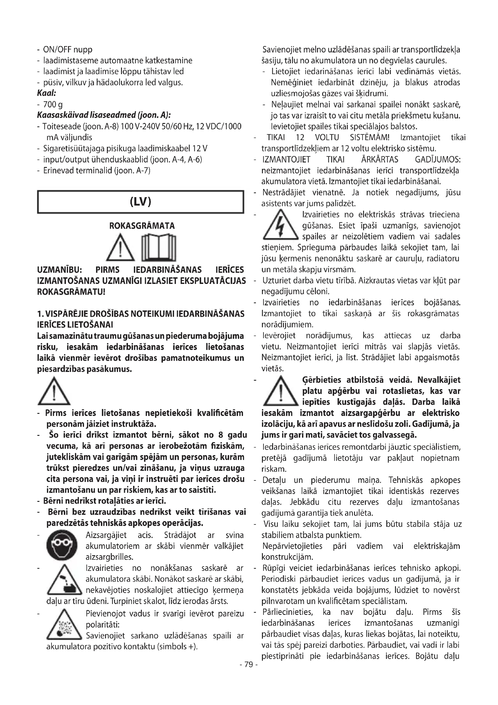 (10AWG) - garums 250 mm - ar PVH izolāciju Apgaismojums: - Gaismas diodes Izejas ligzdas: - divas ligzdas USB 5 V – 1 A/2.1 A - ligzda 12 V - 10 A - ligzda 19 V - 3.5 A Raksturlielumi: - slēdzis ON / OFF - automātiskā izslēgšana atkarībā no uzlādēšanas līmeņa - uzlādes līmeņa un uzlādēšanas pabeigšanas signāllampiņas - nepārtraukti degošs, mirgojošs un avārijas gaismas diožu lukturis. Svars: - 700 g Komplektācijā iekļautie piederumi (att. A): - Barošanas bloks (att. A-8) 100 V-240 V 50/60 Hz, 12 VDC/1000 mA izeja - Uzlādēšanas vads ar 12V “piepīpētāja” tipa ligzdu - Ieejas/izejas savienošanas vadi (att. A-4, A-6) - Dažādi uzgaļi (att. A-7) (BG) РЪКОВОДСТВО С ИНСТРУКЦИИ ЗА ПОЛЗВАНЕ ВНИМАНИЕ: ПРЕДИ ДА ИЗПОЛЗВАТЕ ПУСКОВОТО УСТРОЙСТВО, ПРОЧЕТЕТЕ ВНИМАТЕЛНО РЪКОВОДСТВОТО С ИНСТРУКЦИИ!