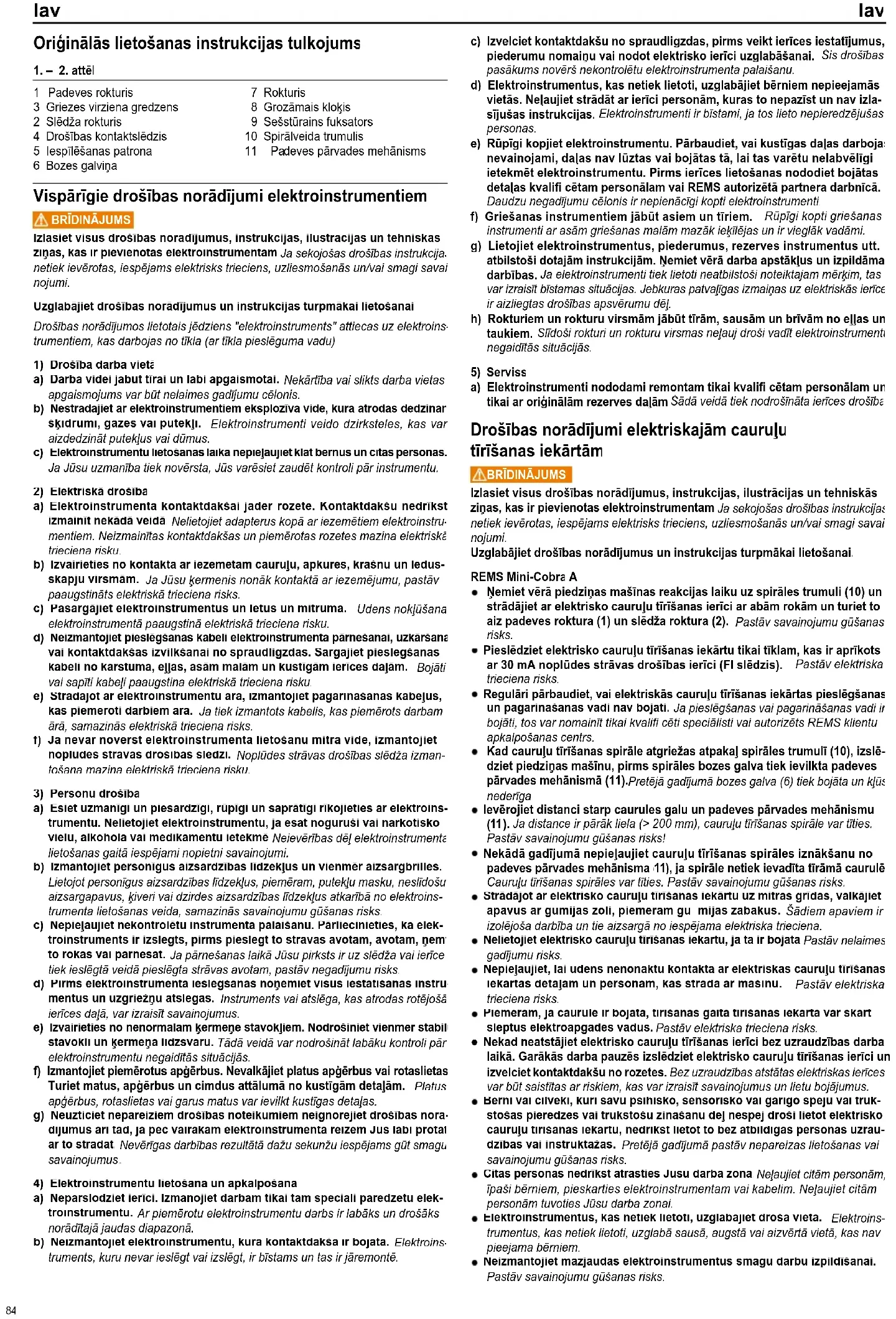 Izlasiet visus drošības norādījumus, instrukcijas, ilustrācijas un tehniskās ziņas, kas ir pievienotas elektroinstrumentam. Ja sekojošas drošības instrukcijas netiek ievērotas, iespējams elektrisks trieciens, uzliesmošanās un/vai smagi savai- nojumi. Uzglabājiet drošības norādījumus un instrukcijas turpmākai lietošanai. REMS Mini-Cobra
