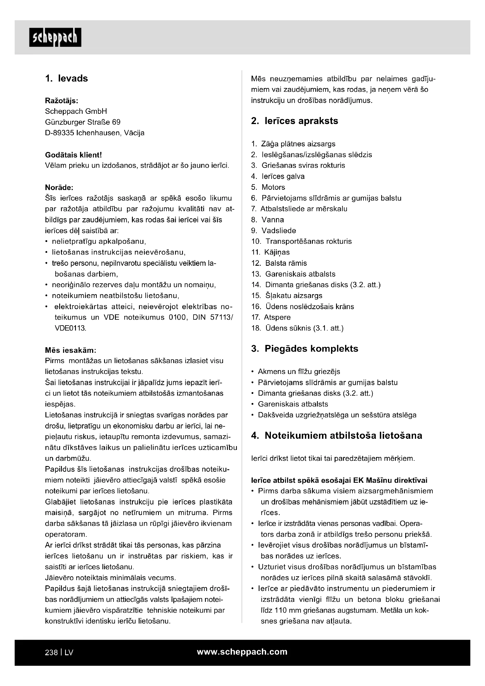 Ražotājs: Scheppach GmbH Günzburger Straße 69 D-89335 Ichenhausen, Vācija Godātais klient! Vēlam prieku un izdošanos, strādājot ar šo jauno ierīci. Norāde: Šīs ierīces ražotājs saskaņā ar spēkā esošo likumu par ražotāja atbildību par ražojumu kvalitāti nav at- bildīgs par zaudējumiem, kas rodas šai ierīcei vai šīs ierīces dēļ saistībā ar: