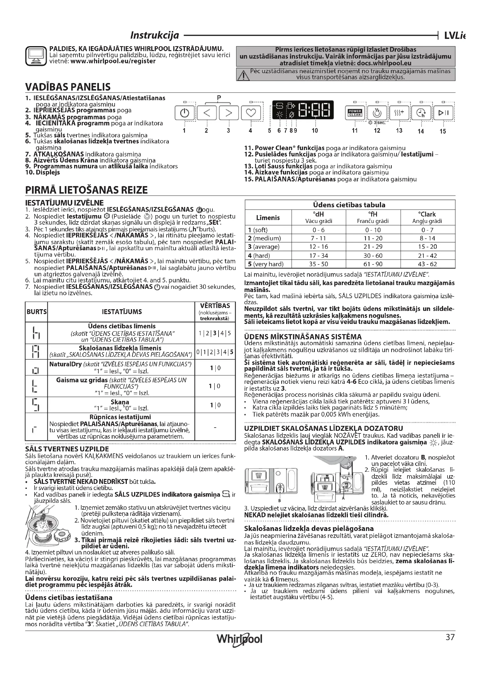 - Ir svarīgi iestatīt ūdens cietību.