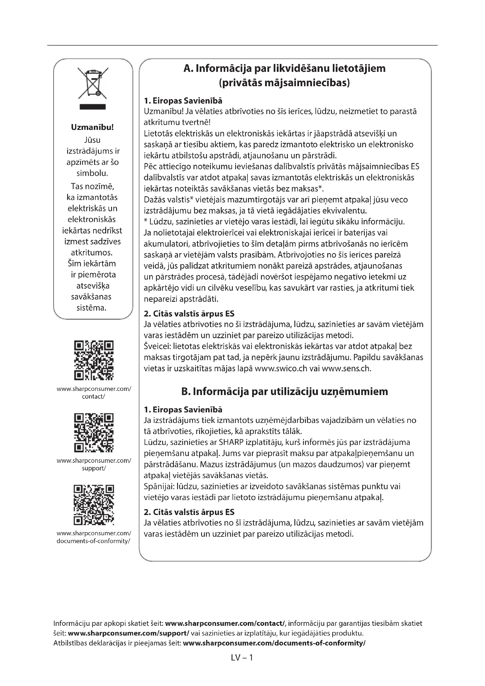 Ja vēlaties atbrīvoties no šī izstrādājuma, lūdzu, sazinieties ar savām vietējām varas iestādēm un uzziniet par pareizo utilizācijas metodi. Uzmanību! Jūsu izstrādājums ir apzīmēts ar šo simbolu. Tas nozīmē, ka izmantotās elektriskās un elektroniskās iekārtas nedrīkst izmest sadzīves atkritumos. Šīm iekārtām ir piemērota atsevišķa savākšanas sistēma. www.sharpconsumer.com/ support/ www.sharpconsumer.com/ documents-of-conformity/ www.sharpconsumer.com/ contact/ Informāciju par apkopi skatiet šeit: www.sharpconsumer.com/contact/, informāciju par garantijas tiesībām skatiet šeit: www.sharpconsumer.com/support/ vai sazinieties ar izplatītāju, kur iegādājāties produktu. Atbilstības deklarācijas ir pieejamas šeit: www.sharpconsumer.com/documents-of-conformity/LV LV – 1LV – 1 A. Informācija par likvidēšanu lietotājiem (privātās mājsaimniecības)